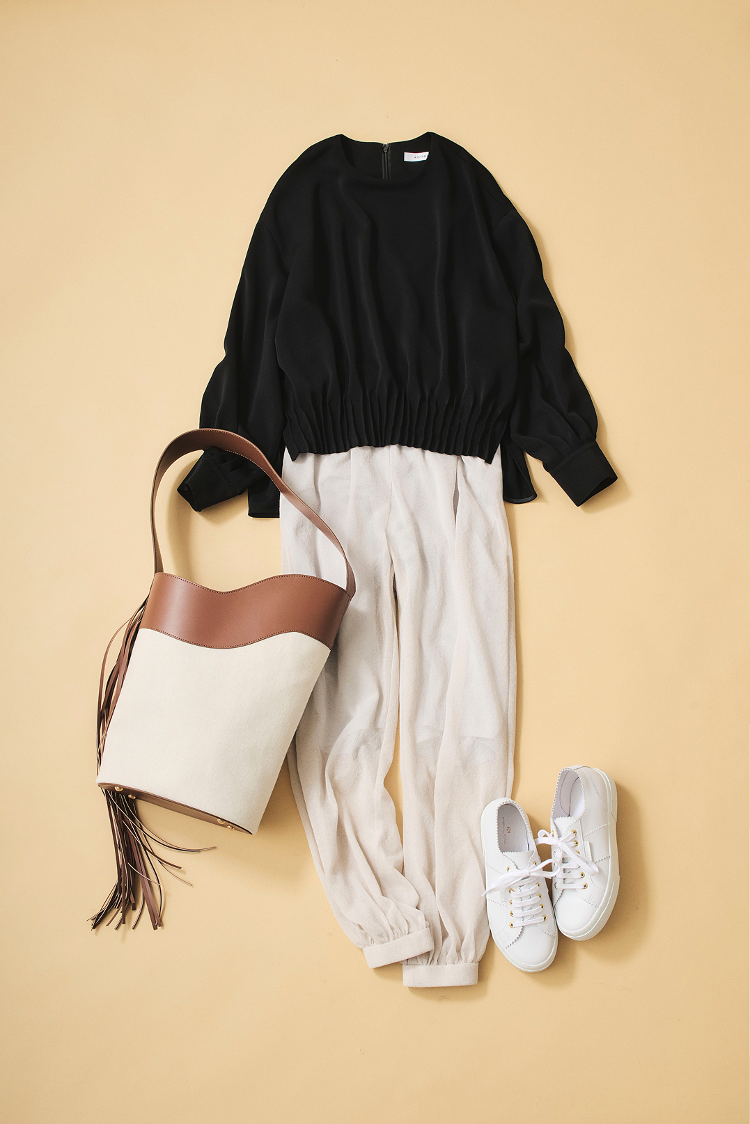 動きのあるシルエットで視線を集めるプルオーバーブラウス