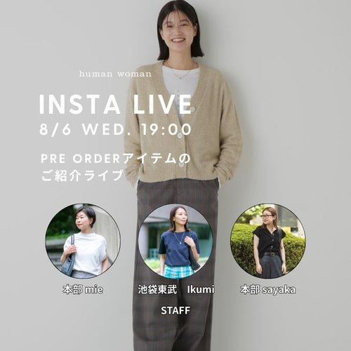 【INSTA LIVE】8/6(水)19:00配信!プレオーダーアイテムのご紹介!|human woman|