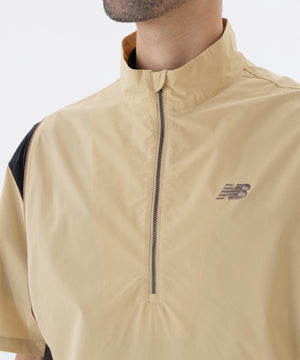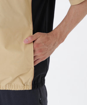 軽やかさと機能性を兼ね備えたハーフスリーブブルゾン。伸縮性に優れた高機能素材「TEXBRID」を採用したストレッチマットタフタを使用し、アクティブにも対応する抜群の動きやすさと快適さを両立。また裏面にコーティング加工を施すことで、軽さを保ちながらもしっかりとしたハリ感と耐久性を実現しています。さらに撥水性があり急な天候変化にも対応可能。一重仕立てで軽やかに羽織れるデザインが季節の変わり目などに重宝します。両サイドの配色や背面ロゴを用いてシンプルな中に印象的なデザインを添えました。