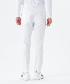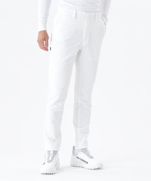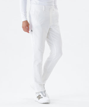 快適な穿き心地と機能性を兼ね備えたロングパンツ。撥水性を備えている為ゴルフラウンド中の急な天候変化にも対応し、常に快適な状態をキープします。また全方向に伸縮する4WAYストレッチ性とテーパードシルエットにより、動きやすさとスッキリとしたスタイルを両立。ジャストレングス仕様で足元のもたつきを抑え、スマートな印象を演出します。前後のポケットに加え、右後ろポケット上にもう一つ、さらに右太腿サイドにファスナーポケットを配置し、小物収納にも優れプレー中の実用性を高めています。