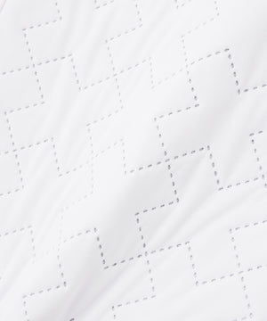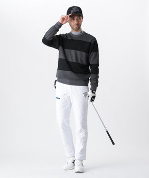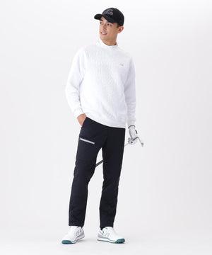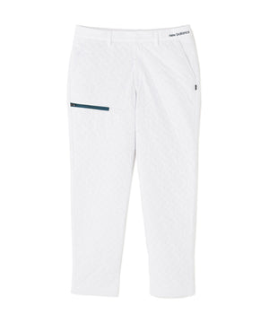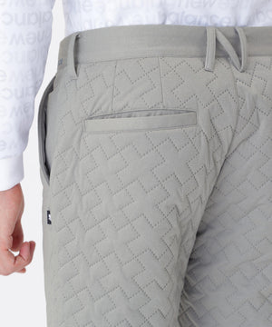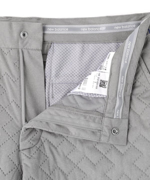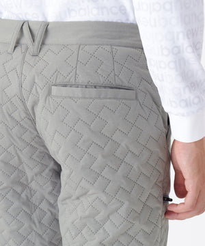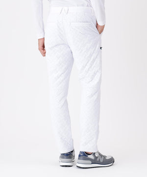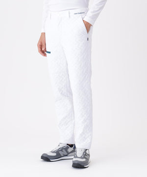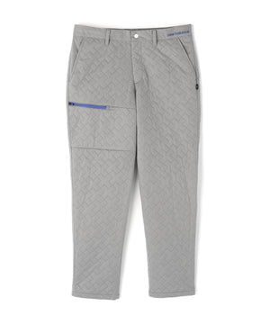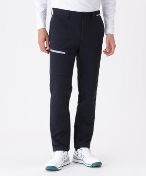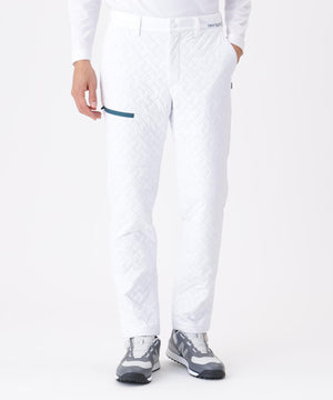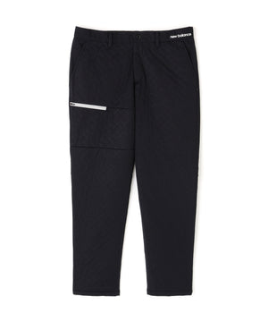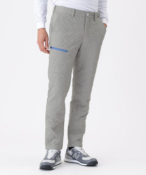 キルトをデザインアクセントとして施したロングパンツ。滑らかなスムースラミネーション素材に、チェッカープレート模様を超音波で圧着したキルティング加工を施しました。縫い目がない為軽量で風を通しにくく、上品な質感とスポーティな印象を演出します。裏地には起毛トリコットを使用し、柔らかく暖かな履き心地を実現。中綿には再生ポリエステルを使用した軽量で高い保温性を誇る「サーモライトエコメイド」を採用し、寒い季節のラウンドでも安心です。テーパードラインでスッキリとした印象に。機能性とデザイン性を両立した、冬のゴルフスタイルを格上げするアイテムです。