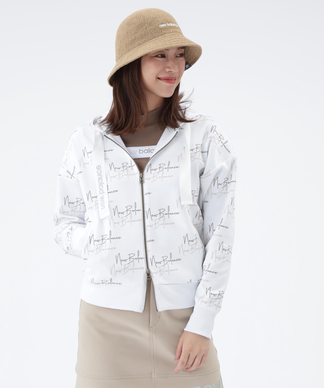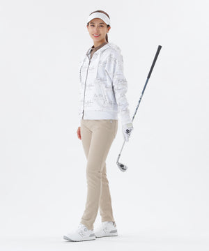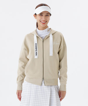 スポーティーな可愛らしさを効かせたフルジップフーディー。軽やかで膨らみ感のあるライトダンボールニットを使用。伸縮性に優れた素材で、ラウンド中も快適に動けるストレッチ性と、型崩れしにくいリラックス感のあるシルエットが魅力です。吸汗速乾性やUVカットといった機能を備え、日差しや汗にも対応。さらに再生ポリエステルを取り入れたサステナブルアイテムです。後ろの重なり合ったロゴ使いが印象的なベージュと、華やかさを添えたシグネチャーモノグラム柄を展開。スポーティーな雰囲気の中に太めのロゴ入りフード紐が可愛らしいアクセントになっており、スタイリングにさりげない遊び心をプラスします。