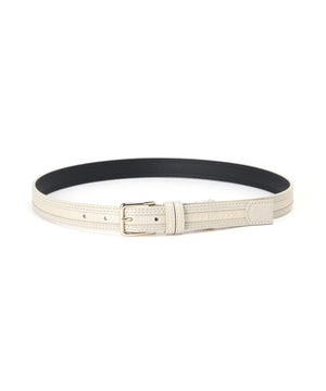 ウエストに上品な存在感を与えてくれるシンセティックレザーベルト。しっかりとした厚みとしなやかさがある高品質な日本製合成皮革を使用しています。ダブルループ仕様でベルトをしっかり固定。ベルト先にブランドロゴを施しており、主張しすぎないアクセントと高級感を演出します。キラッとした洗練されたデザインが腰回りをこなれた雰囲気に導き、スタイリング映えすること間違いなしです。