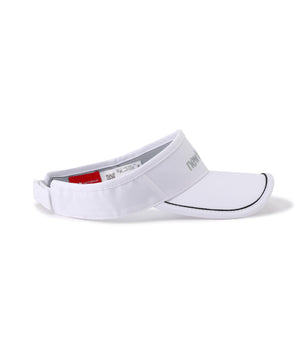 上品なスポーティーさを演出するバイザー。軽量でハリのある綺麗なタフタを使用した、スッキリとしたシルエットが特長。肌に当たるスベリ部には吸汗速乾性を備え、長時間のラウンドでもサラリとした快適な状態を保ちます。後ろのサイズアジャスターでフィット感の調整が可能。ロゴやラインを配し、シンプルながらも印象的なデザインに仕上げました。髪型が崩れにくく、ラウンド中もキレイなヘアスタイルで楽しめます。