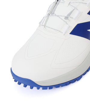 プレーに妥協しないゴルファーのためのスパイクレスシューズ「FuelCell 1001 V5」BOA対応モデル、限定カラー ホワイト/ ロイヤルブルー。ノーソーで快適なフィット感の防水アッパーに、Data to Designに基づいた新アウトソールが高いグリップ力と安定性を発揮します。