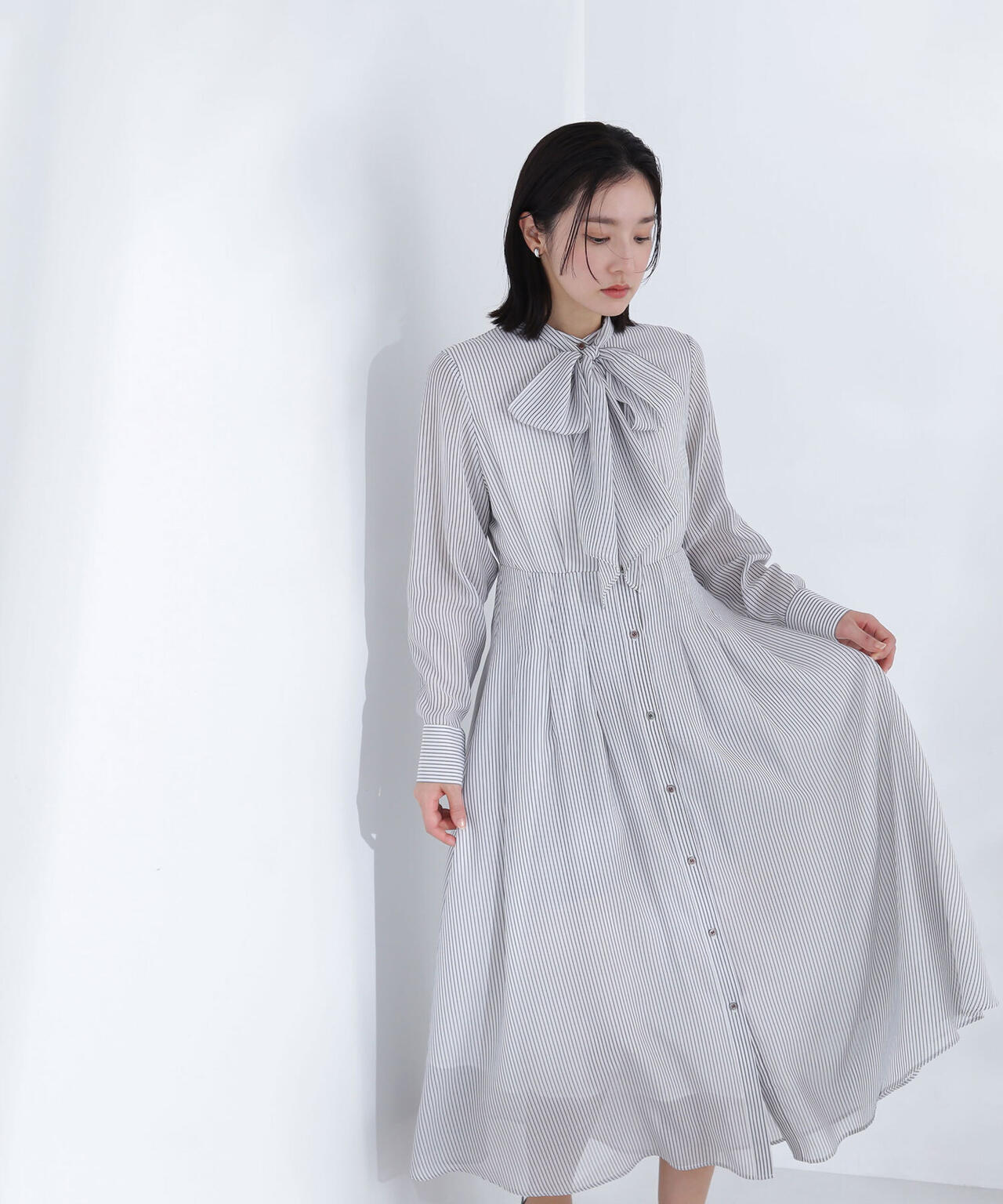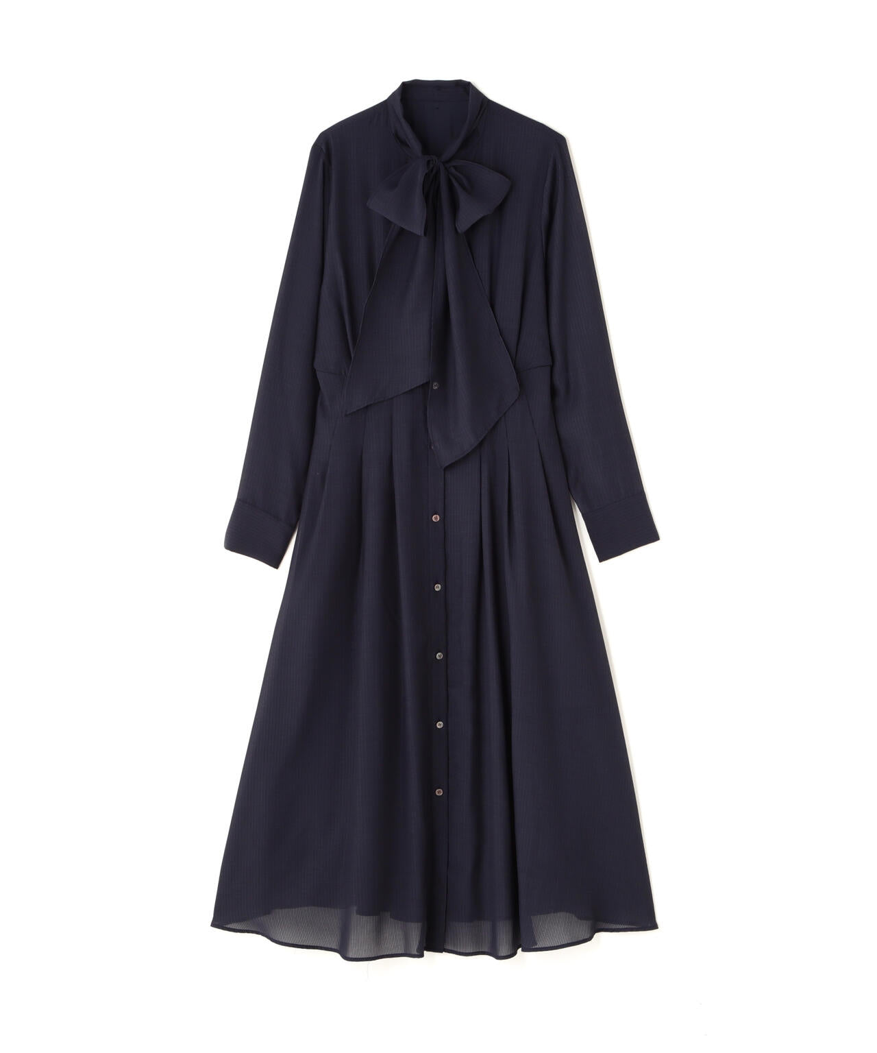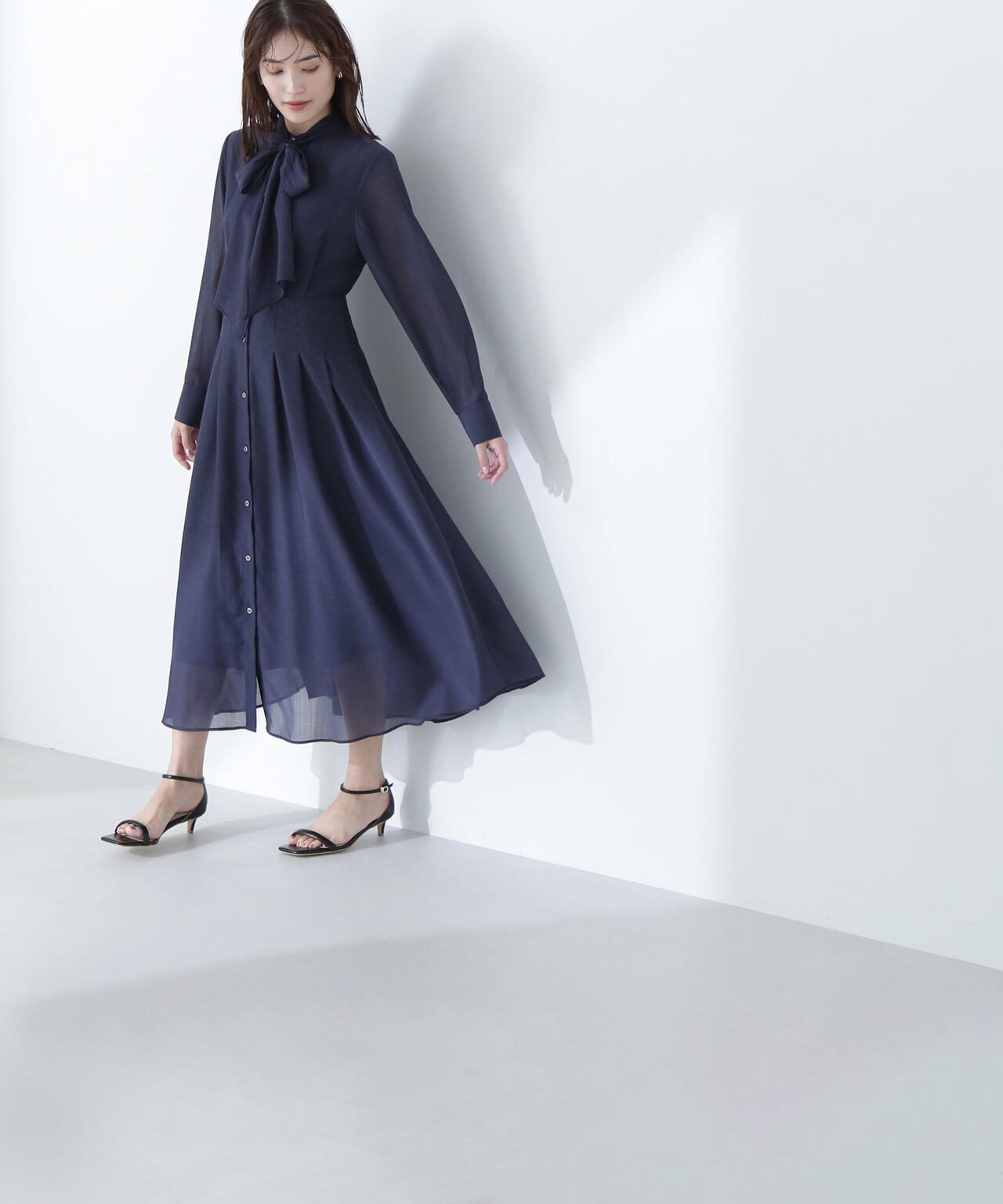 フィット&フレアシルエットでスタイルアップを叶えてくれるワンピース。共地のリボンタイは取り外し可能なため、2パターンのネックデザインで着ていただけます。ウエスト上下にタックを入れてシルエットを維持しているので、ベルトを外してもキレイなシルエットのまま着こなせます。