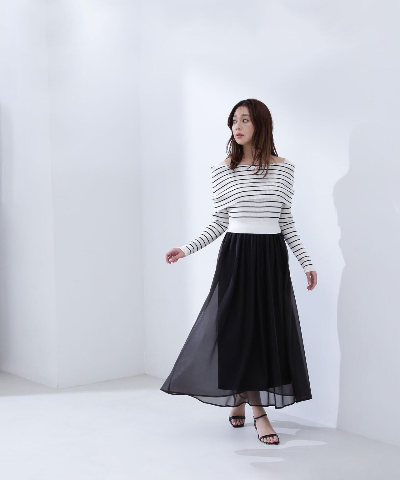 トップスは肌触りの良いハイゲージのリブニット、スカートはフレアがキレイに広がるしなやかなシアーオーガンジーを使用しています。