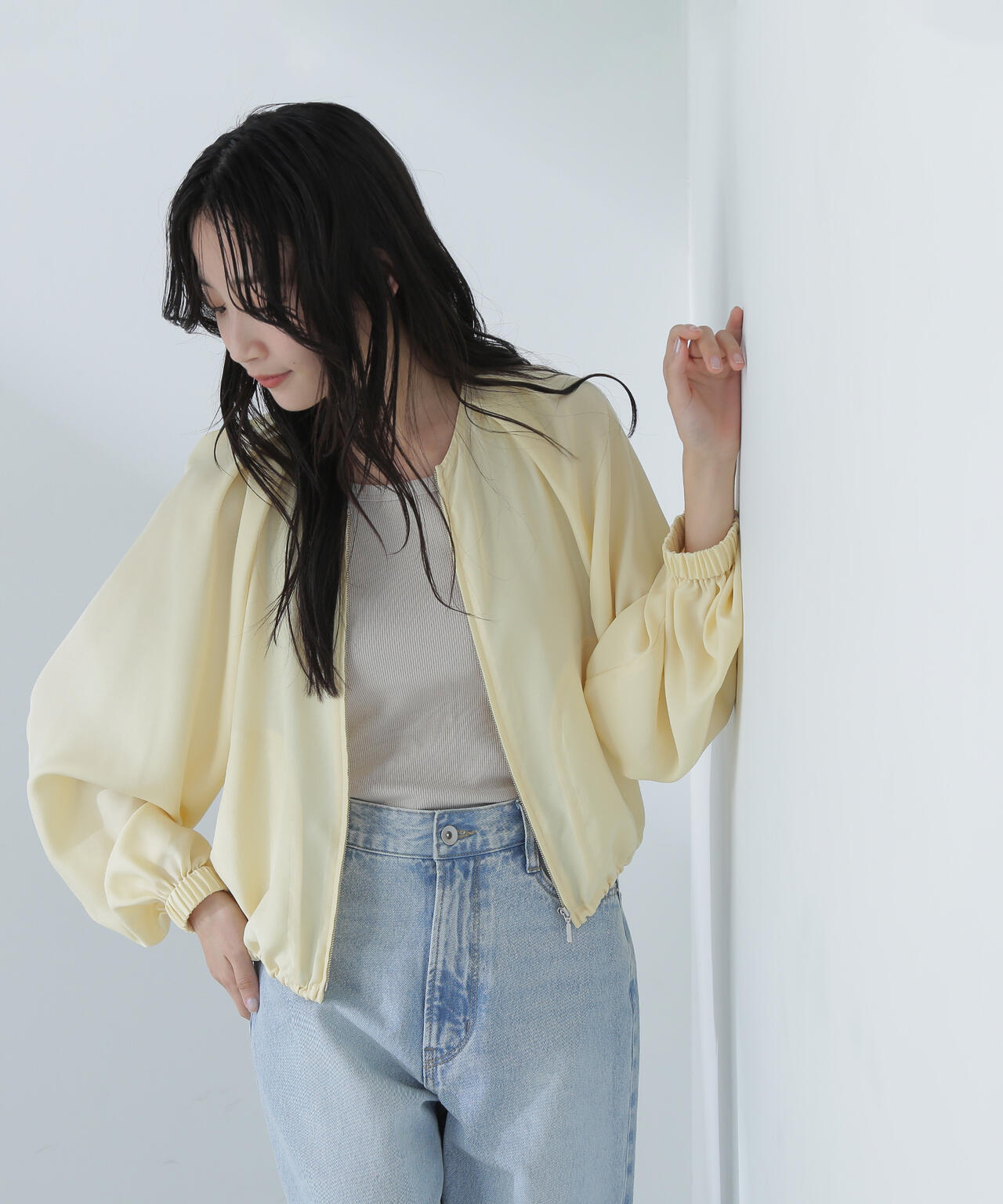 裾にあしらったドローストリングを調整すると、フォルムシルエットになるクロップドブルゾン。薄手の生地でも単調にならないよう、襟ぐりに入れたタックがポイントになります。フロントに付けた金属ファスナーがキラッとポイント。透けすぎないシアー感で肌が見えすぎず、春先から着やすいアウターです。