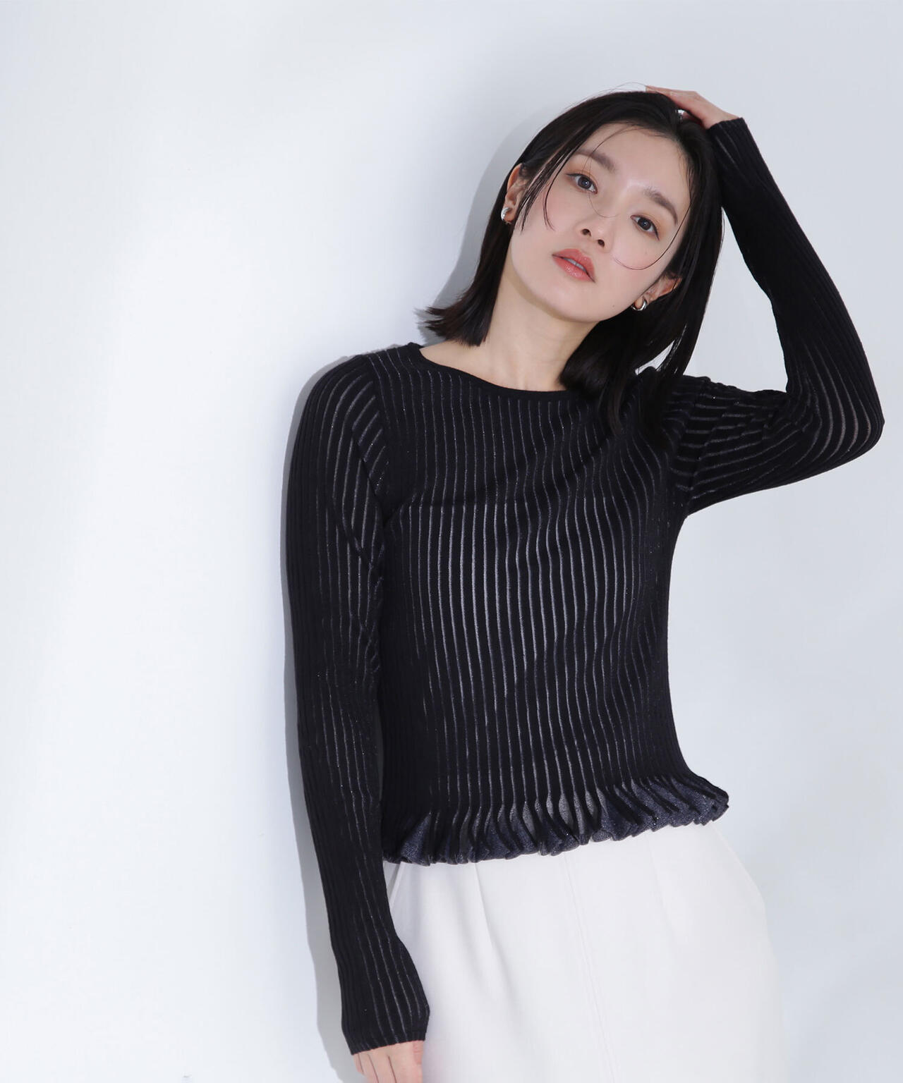 編地の切り替えにより、透ける部分と透けない部分を表現し、シンプルながらアクセントが効いている主役級リブニット。タッチの良い柔らかいニットとハリのあるシアーニットの2素材を使用しています。裾はひらひらと広がるため、アウトスタイルで着るのがおすすめ。襟はクルーネックデザインで着回しができ、スッキリと着ていただけます。