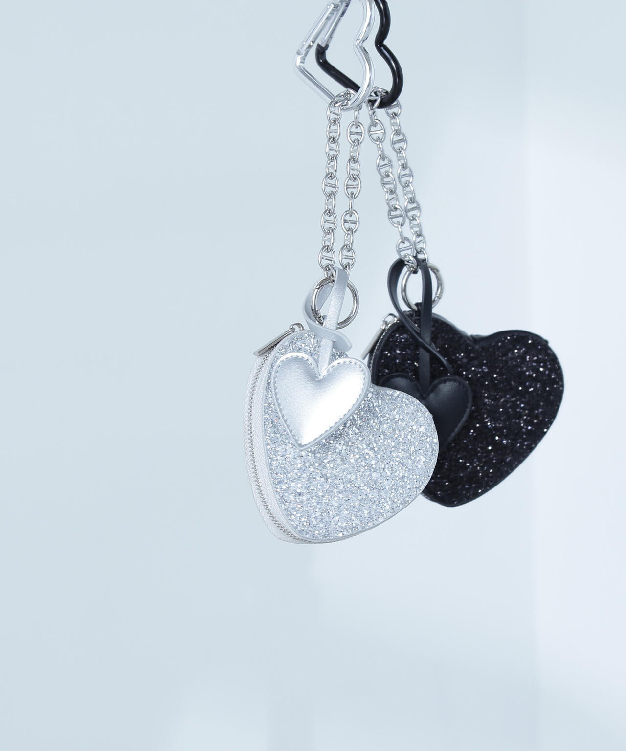 様々なハートモチーフを組み合わせた楽しいチャーム。グリッター素材のポーチはキーケースやイヤホンケース、ピルケースなどちょっとした小物入れとしてもお使いいただけます。お持ちのシンプルなバッグに付けるだけでいっきに今年顔のBAGにアップデートできる便利なアイテム。デリケートな素材を使用しております、グリッター素材のため、洋服など身の回りのモノに引っ掛けや衝撃によって取れてしまう恐れがりますのでご注意ください。