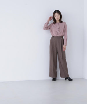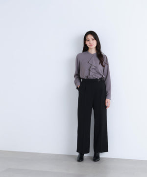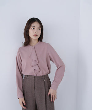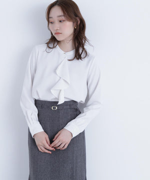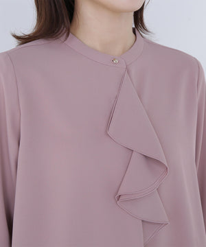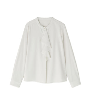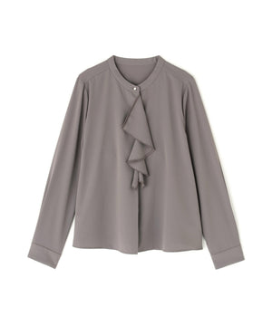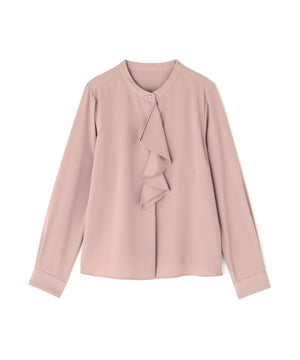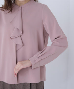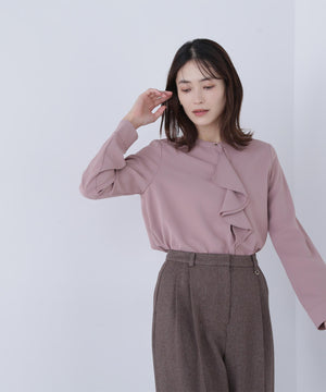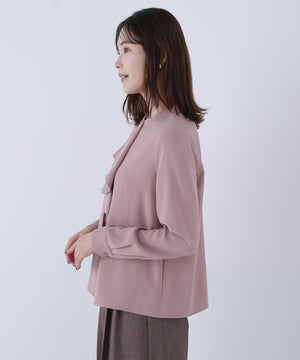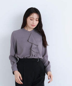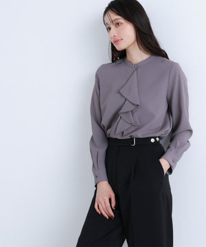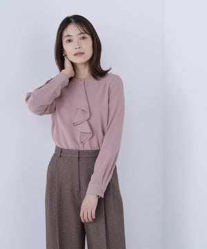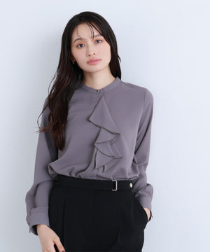 華やかな2枚仕立てのラッフルが目を引き、軽やかな揺れ感が女性らしさを引き立てるブラウス。首元に付けたゴールドカラーの釦が上品なアクセントになっています。フェミニンさときちんと感があり、通勤スタイルにもぴったり。ダブルラッフルや金色ボタンがジャケットインでも存在感を発揮する、ONにもOFFスタイルにも万能な一枚です。