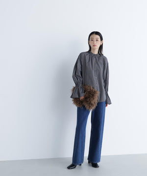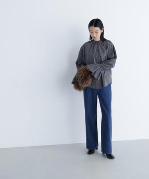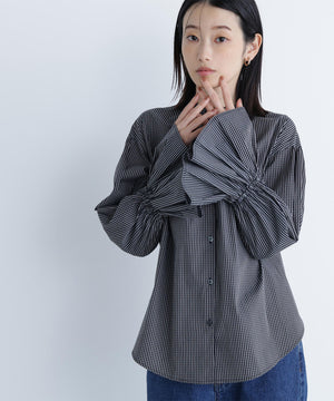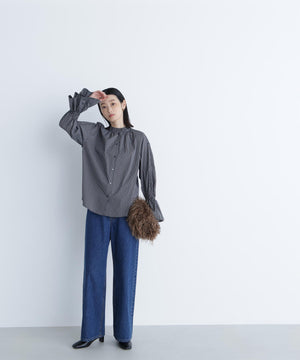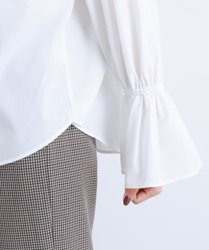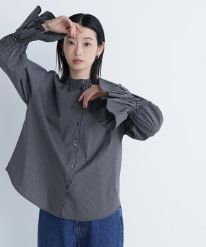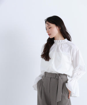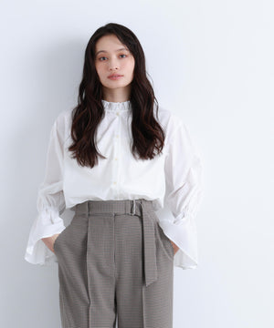 スタンドネックとカフスのフリルディテールが華やかなアクセントになるブラウス。一枚で着映えするのはもちろん、ニットやジャケットとのレイヤードスタイルもおすすめです。無地のオフホワイトは汎用性抜群で、幅広いスタイルに合います。チェック柄は今年らしさを取り入れたトレンド感のあるカラーです。