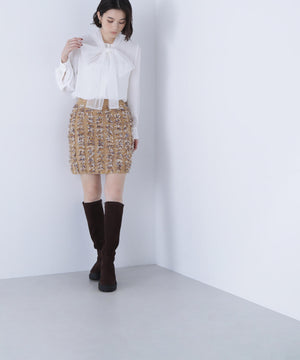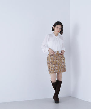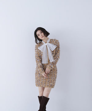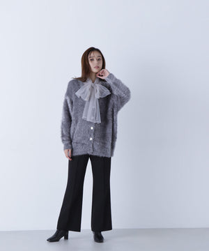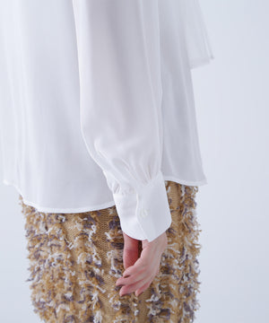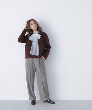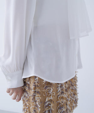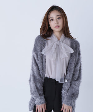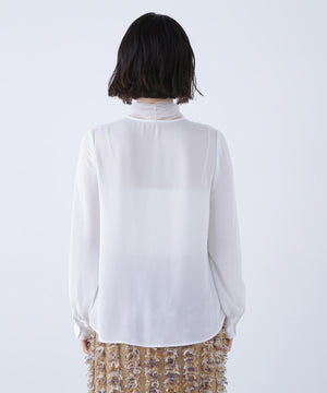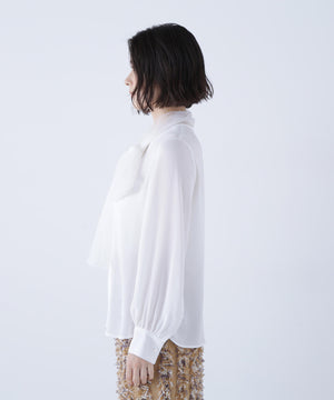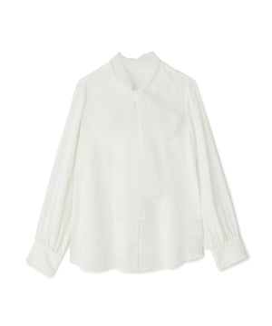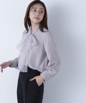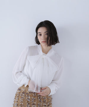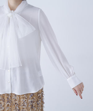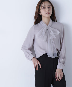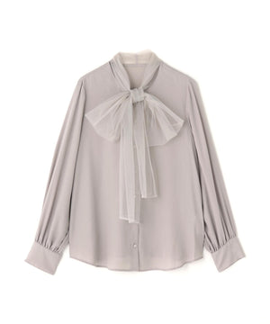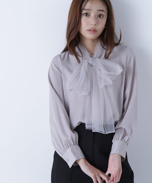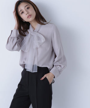 軽やかなチュール素材のボウタイが目を引くブラウス。ボウタイリボンによって首元にふんわりとした動きがつき、フェミニンな印象に見せてくれます。1枚着はもちろん、ジャケットやジャンスカとのレイヤードのインナー使いにもおすすめ。ONにもOFFスタイルにも着回せます。