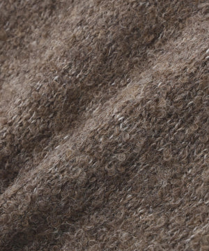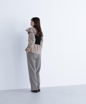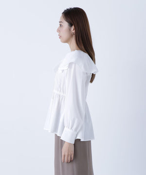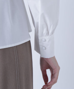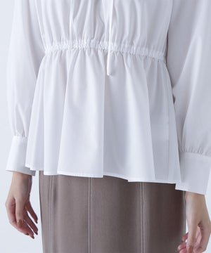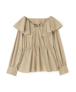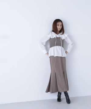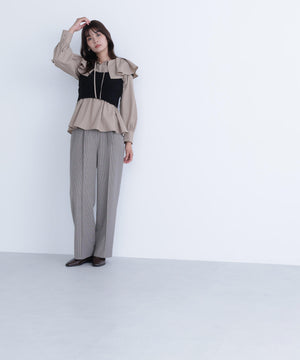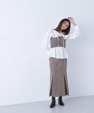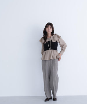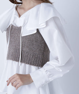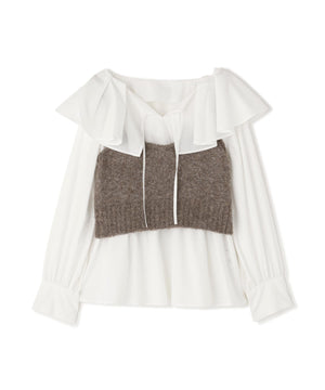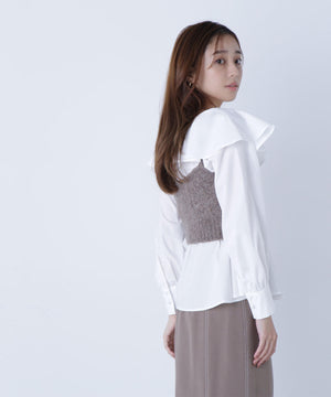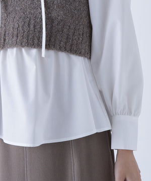 ブラウスはハリ感のあるブロード素材、ニットはふんわりとしたブークレ素材を使用しています。
