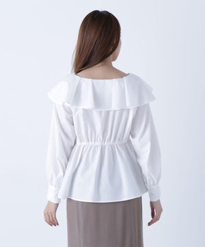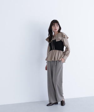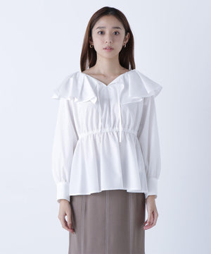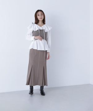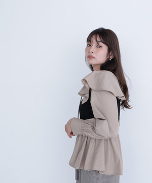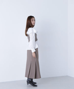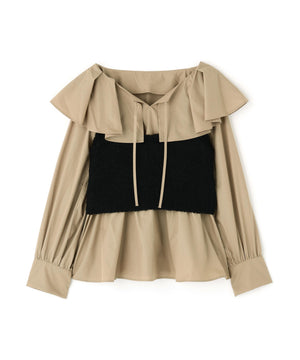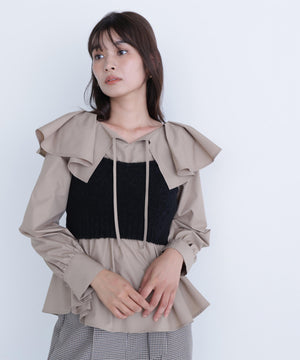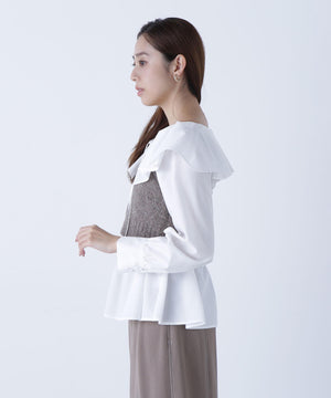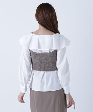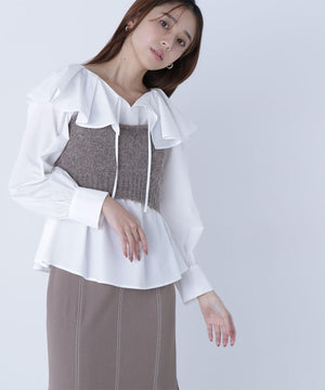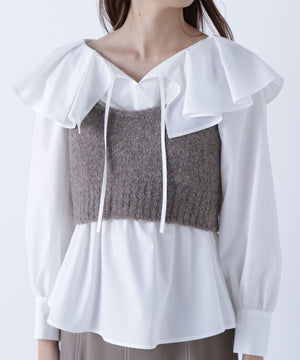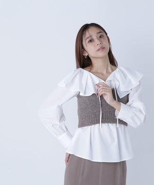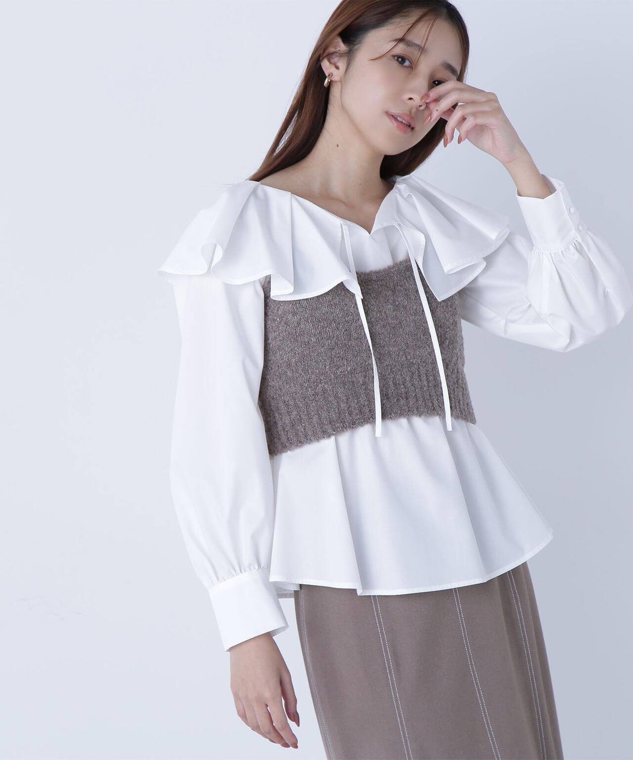 トレンドのラッフルブラウスとニットビスチェがセットになったお得なアイテム。ブラウスは単品使いもでき、1枚でフェミニンなペプラムシルエットを演出します。襟はボリュームのあるラッフルで顔まわりを華やかに見せながら、スリットネックで抜け感をプラス。ニットビスチェはブークレ素材でトレンド感をアップしつつ、旬なレイヤードスタイルが叶います。