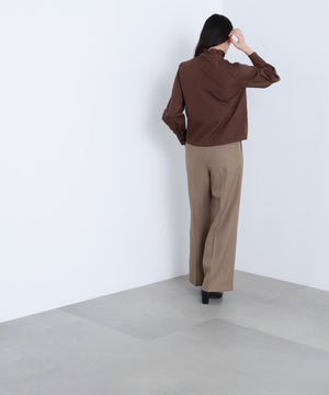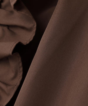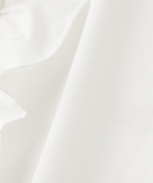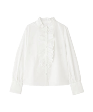 フロントの大振りフリルがアクセントになり、一枚で華やかに決まるブラウス。カーディガンやプルオーバーをレイヤードすると、襟と胸元のフリルが映えてスタイリングをアップデート出来ます。デニムと合わせたフレンチトラッドスタイルもおすすめ。甘いディテールながらハリのある素材なのでカジュアルスタイルも楽しめます。