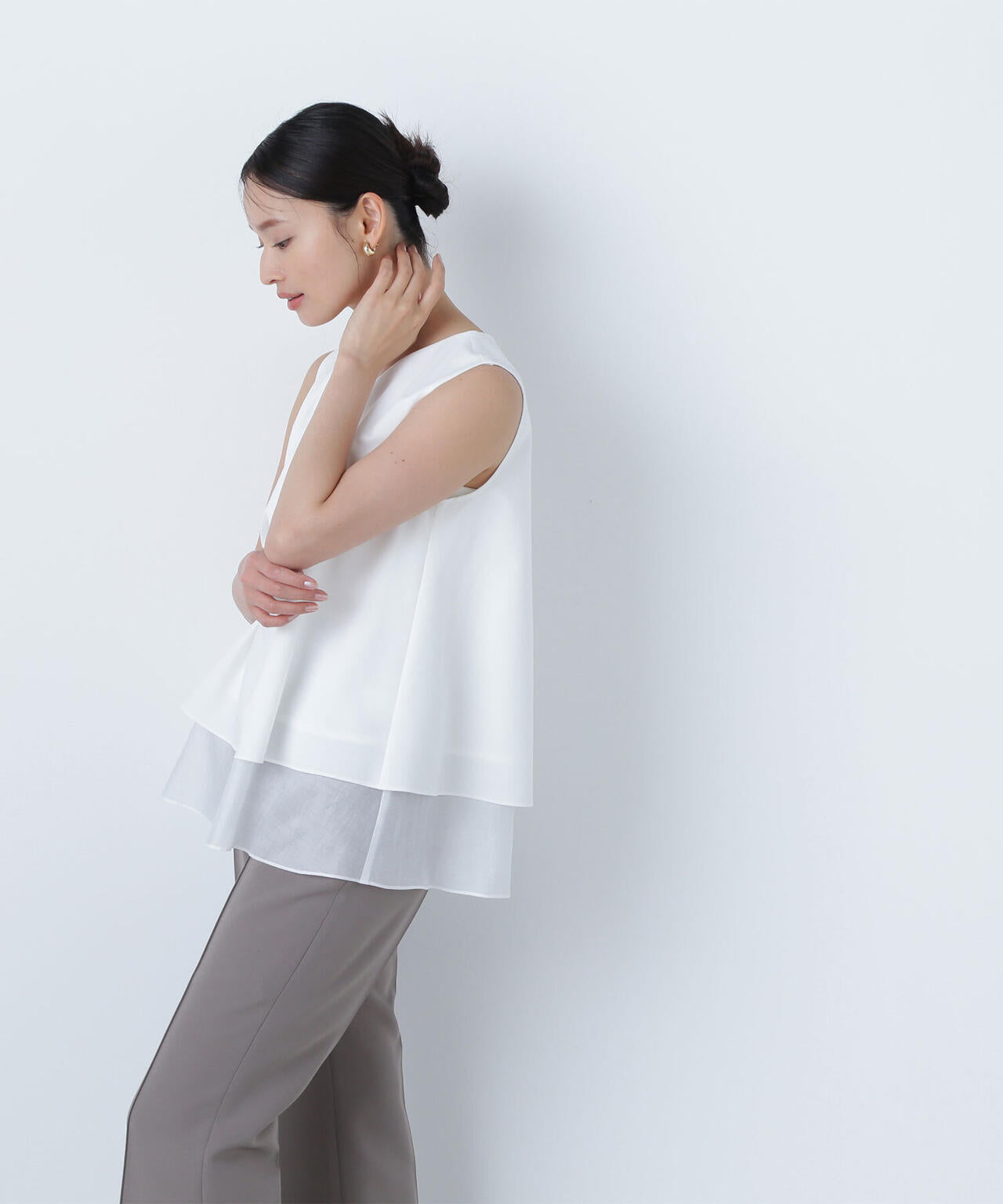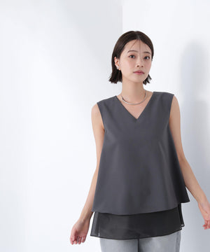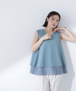 異素材が2段にレイヤードされた風合いの違いを楽しめるデザインで、裾のシアー感がスタイリングに軽さを出してくれるブラウス。裾まわりが緩やかに広がるテントラインは、パンツもナロースカート合わせもおすすめ。肌離れの良いAラインのシルエットなので涼しく着ていただけます。