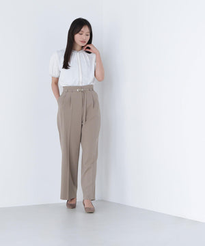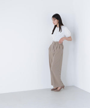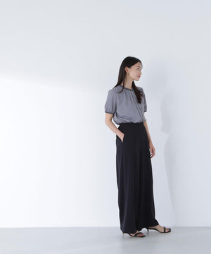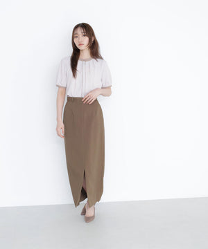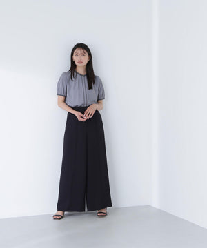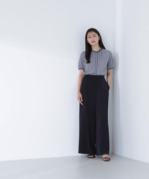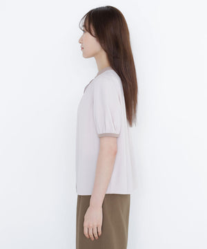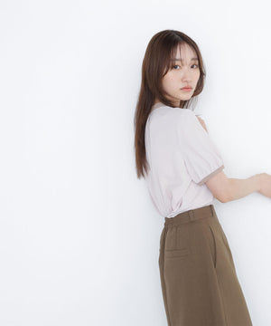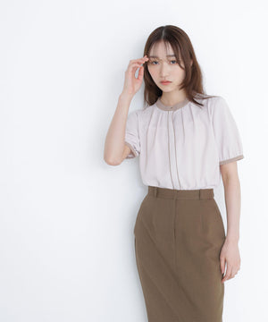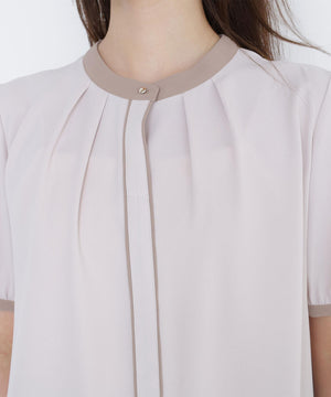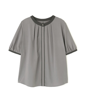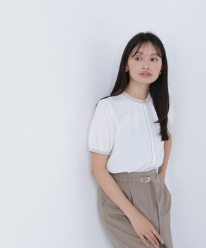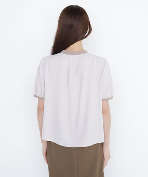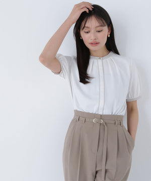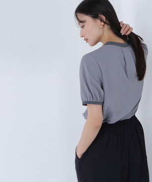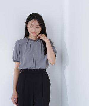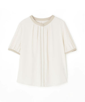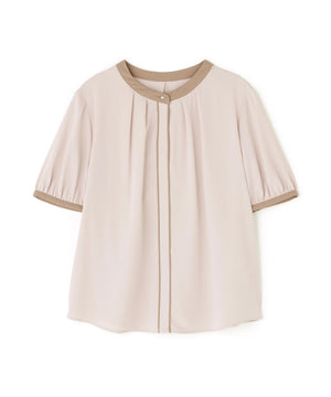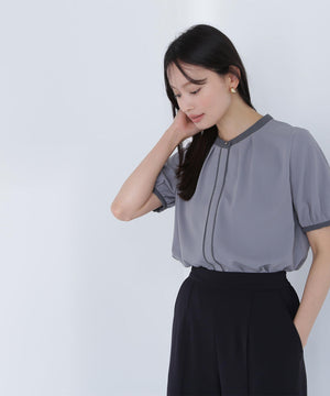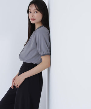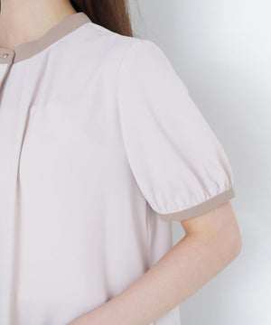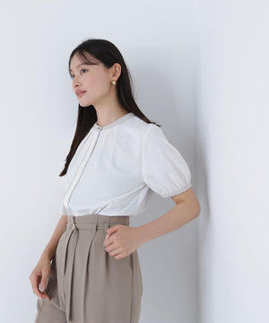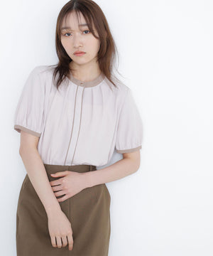 襟ぐりから前立て、袖口にバイカラーの配色と、きらっと光るゴールドカラーの釦をポイントに効かせたブラウス。袖はパフスリーブで女性らしさをプラス。襟はクルーネックで抜け感を出し、フロントタックデザインが、首元を華やかに見せてくれます。