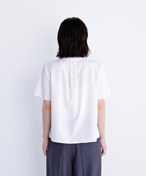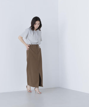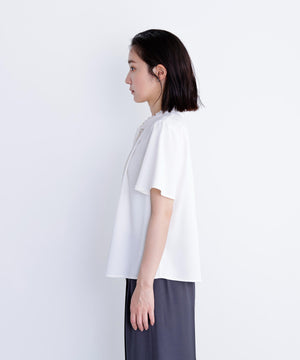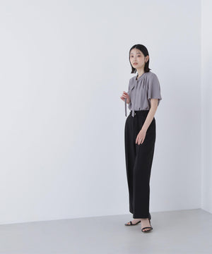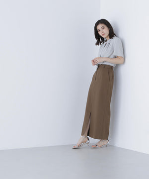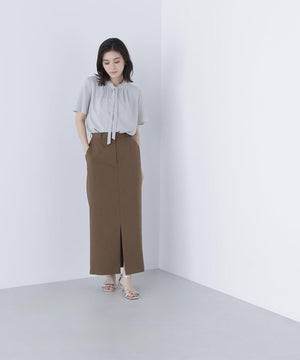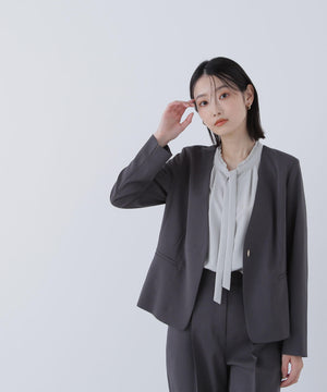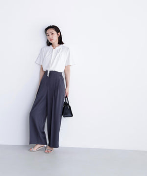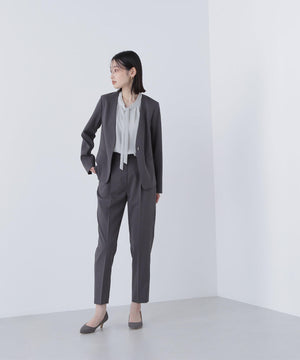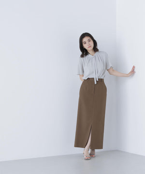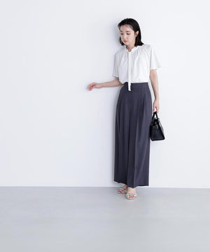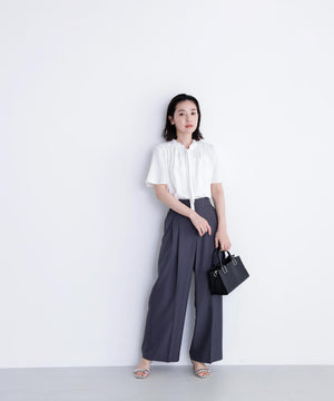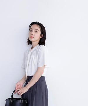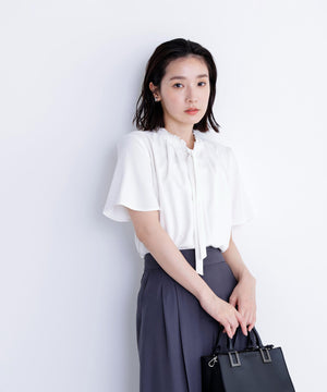 襟ぐりにあしらったフリルデザインが女性らしく、1枚でもジャケットインでも映えるナローボウタイブラウス。フリル襟の甘さを抑えてくれるナローボウタイは、リボン結びではなく、ひと巻きしてから垂らすとスタイリッシュな印象に見せてくれます。二の腕をカバーするフレアスリーブとフロントにタックを入れた立体的なデザインは、ウエストインがおすすめ。スカートもパンツも合わせやすく、オンにもオフシーンにも着ていただけます。