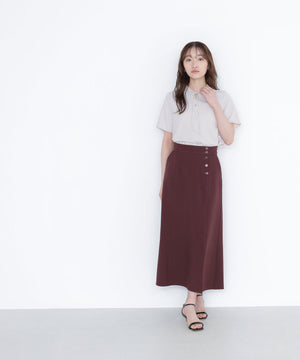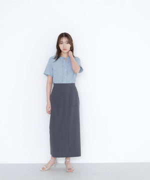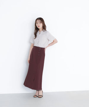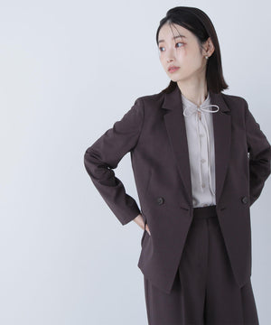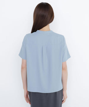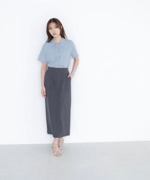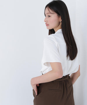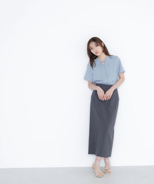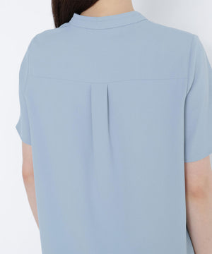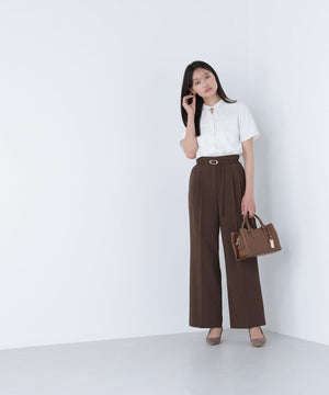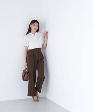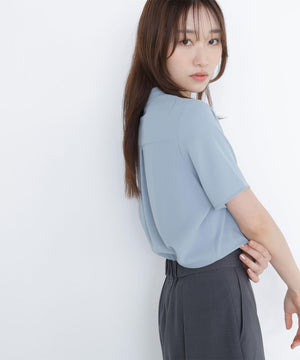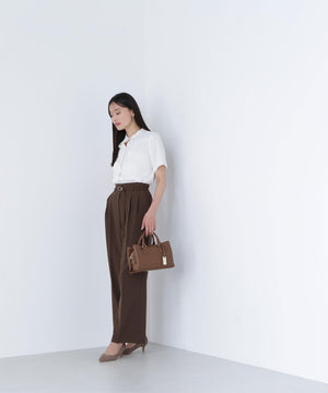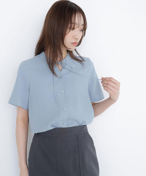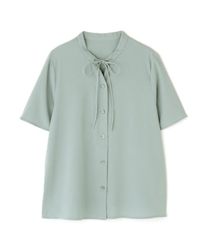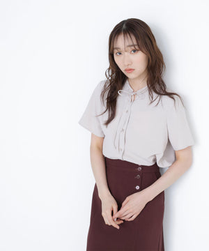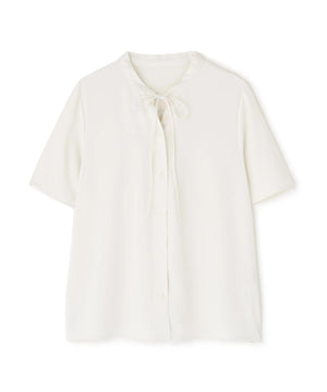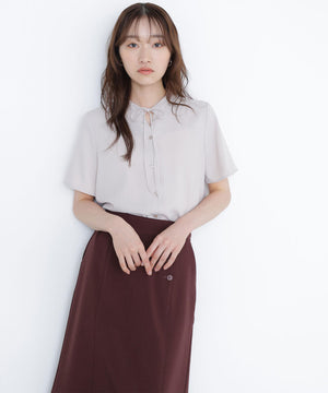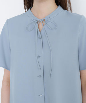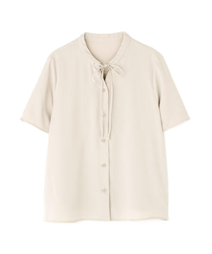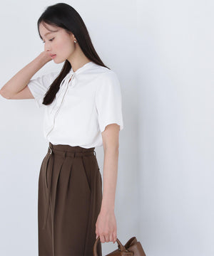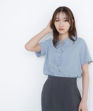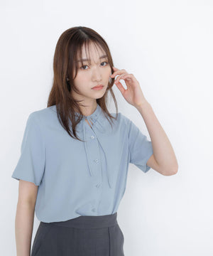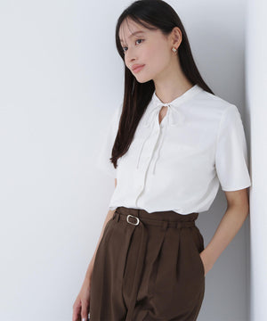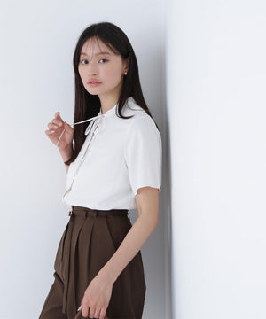 コーディネートに馴染みやすい華奢なリボンタイがポイントのブラウス。浅めのVネックで首元に抜け感を出しながら、夏も涼しく着ていただけます。プレーンなシャツ袖なのでリボンタイでもスタイリッシュな雰囲気が叶います。