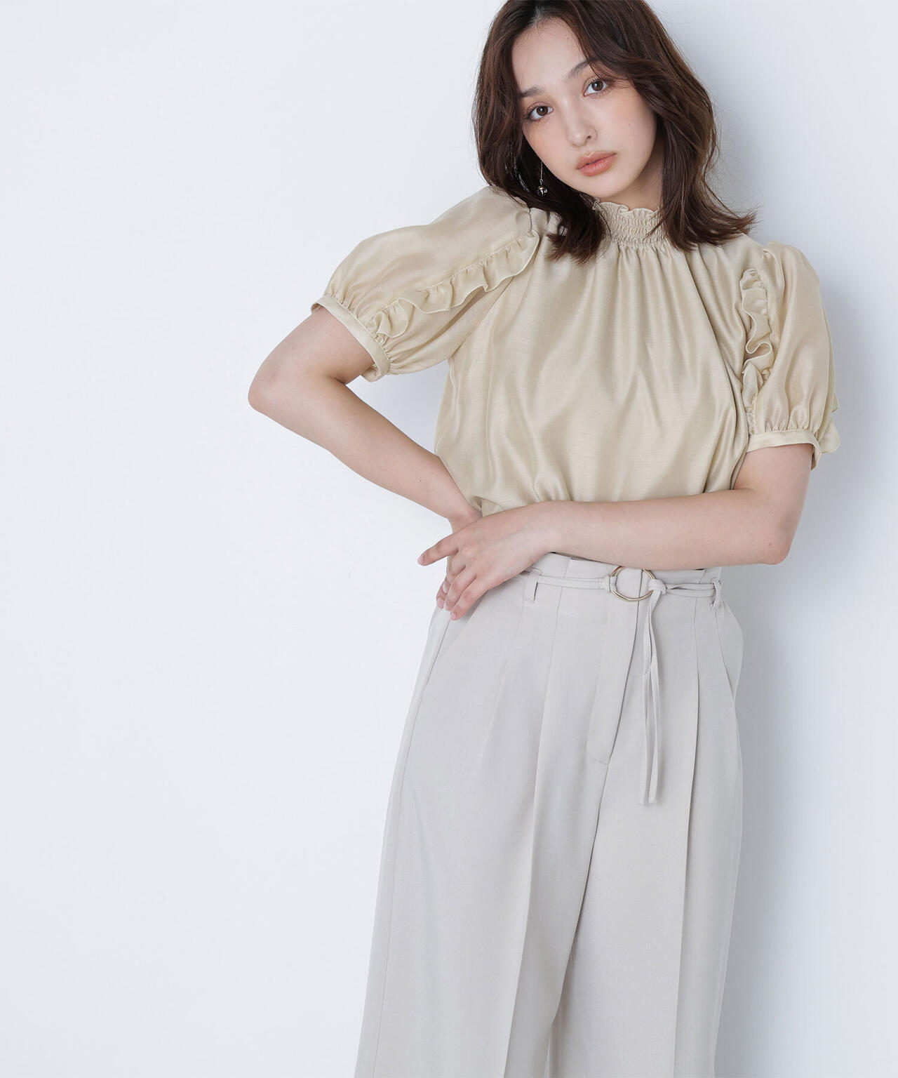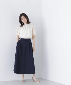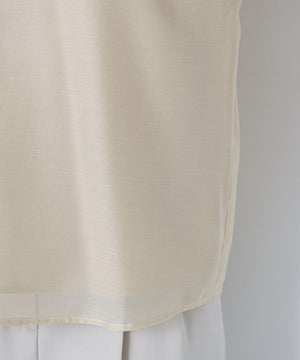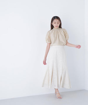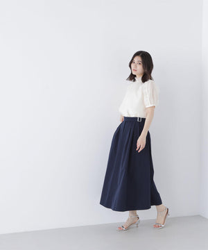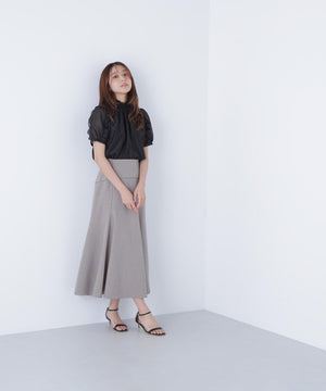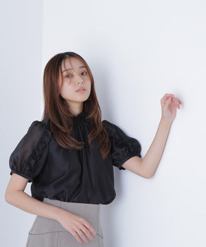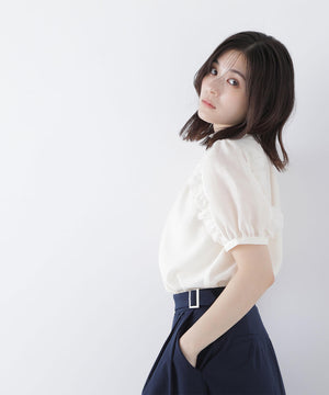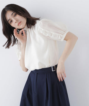顔まわりを華やげるシャーリングネックがポイントのシアーブラウス。シアー素材を使用しているので、シャーリングネックでも軽やかな雰囲気です。シャーリングの襟ぐりは細ゴムを通しているため、程よくフィットしながら窮屈さを感じさせない着心地です。袖はフリルを前後に挟み込んだパフスリーブデザインが、二の腕をカバー。フレアスカートを合わせてフェミニンにも、ナロースカートを合わせれば、すっきりとした雰囲気にも着こなせます。普段着からオフィスシーンまで着回せるデザインです。