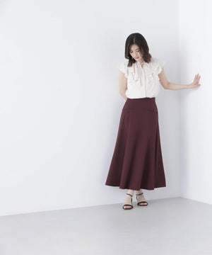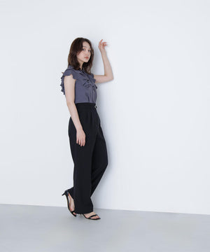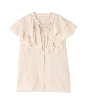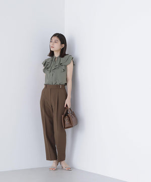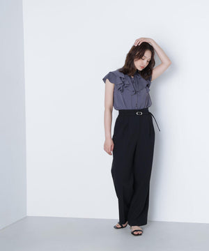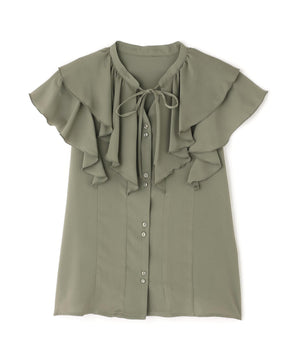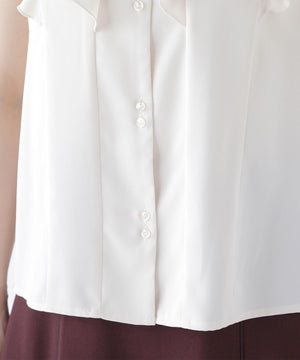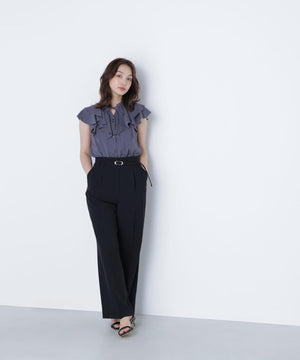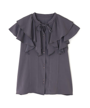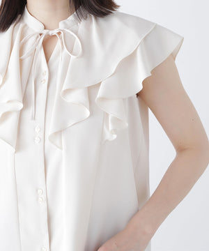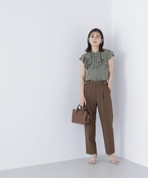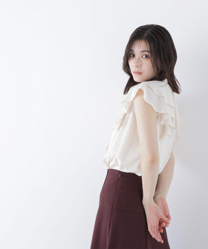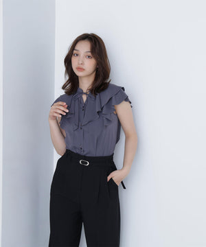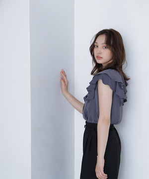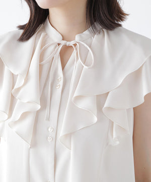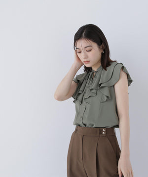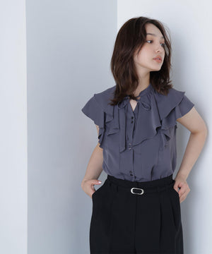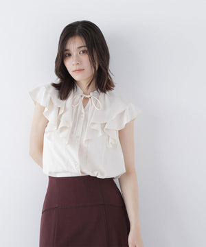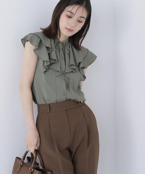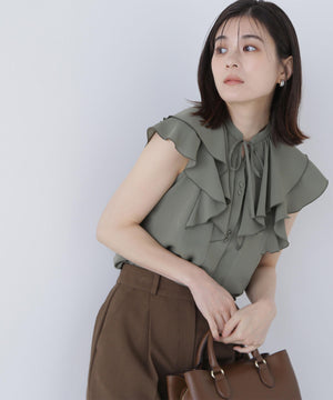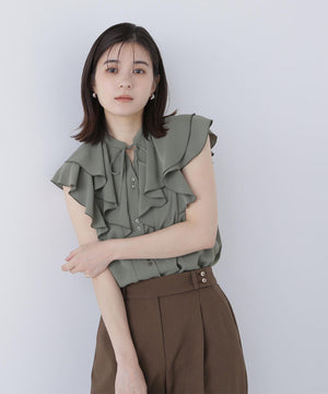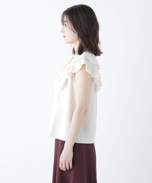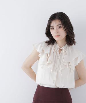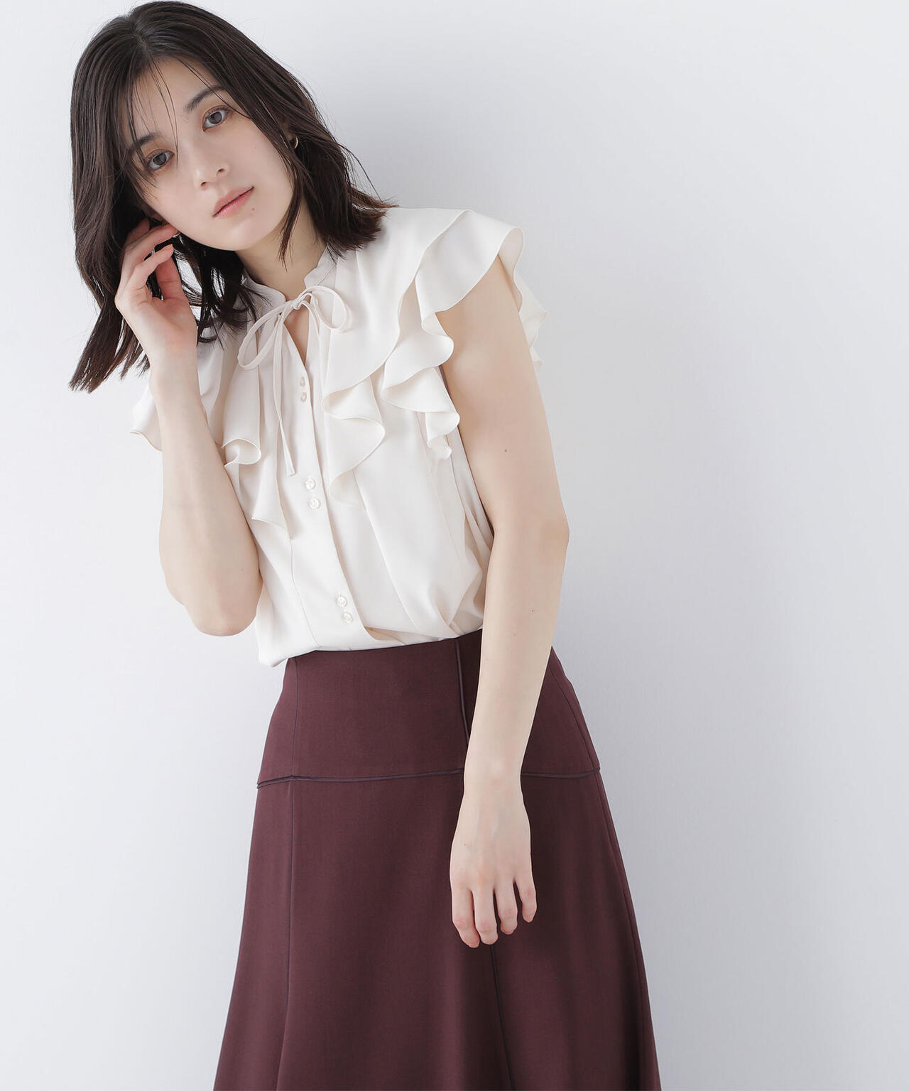 ラッフルデザインが顔まわりを華やかに見せてくれる上品な印象のブラウス。肩先を隠してくれるフリルスリーブが、気になる二の腕をカバーします。フロントのダブル釦もポイント。ゆとりのあるサイズ感なので体のラインを拾いにくく、ONスタイルにも活躍できます。