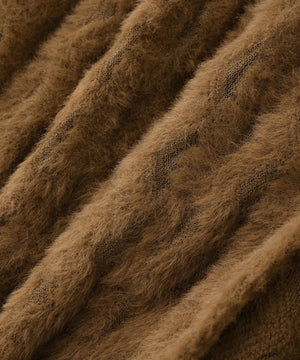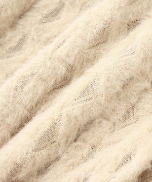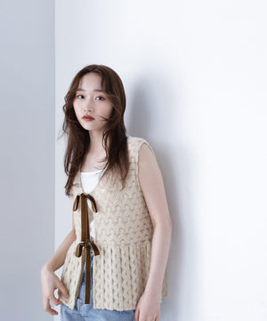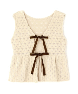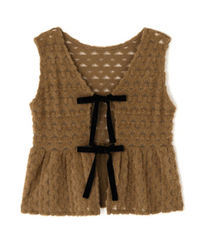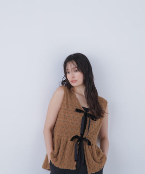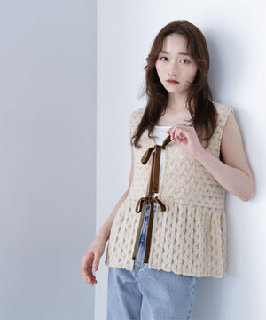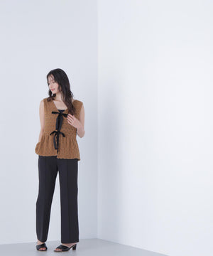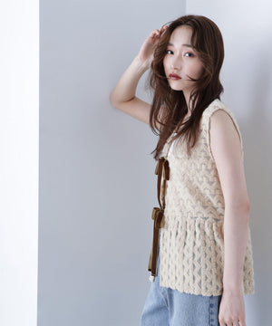 インナーの上に羽織るだけで季節を先取りできるフェザーレースジレ。フロントのリボンをアクセントに、Vネックラインで抜け感があり、アクセサリーも映えるデザインです。ペプラムシルエットなので気になるお腹まわりをカバー。毛足のあるフェザーレースながら、透け感がある素材なので早い時期から着ていただけます。