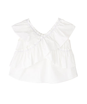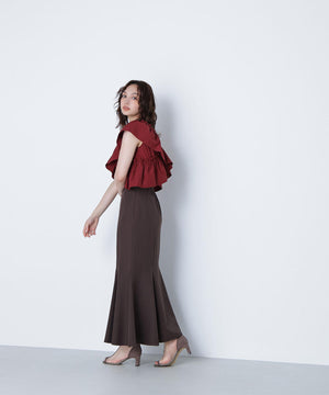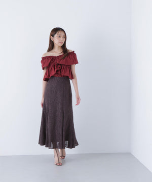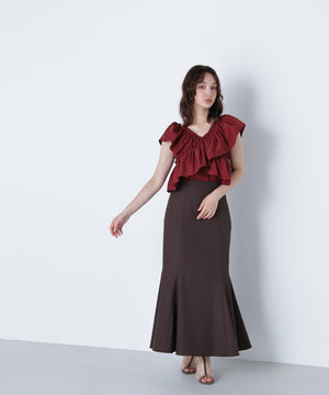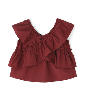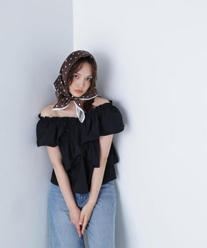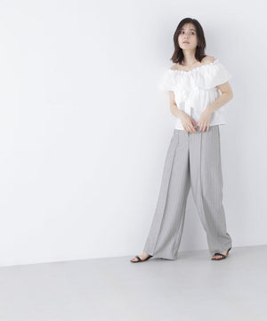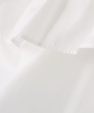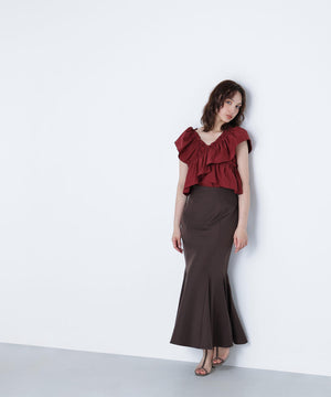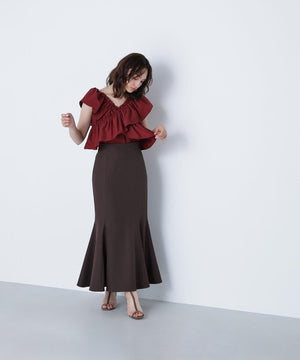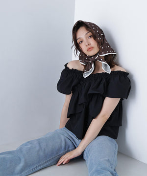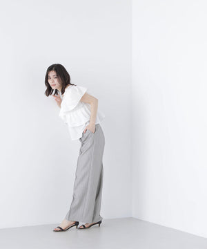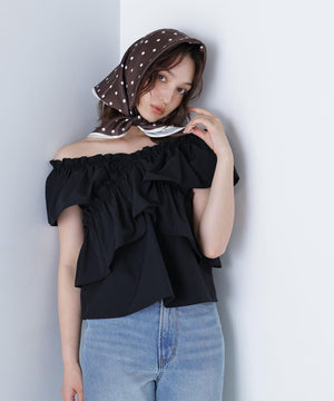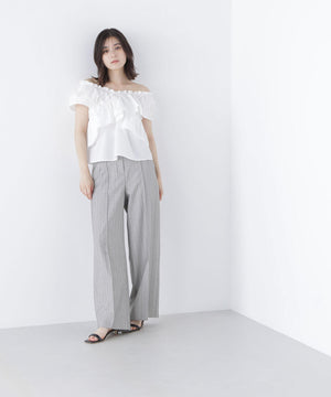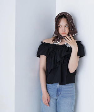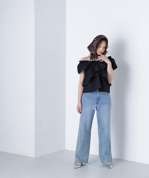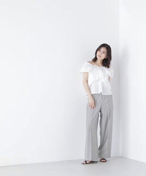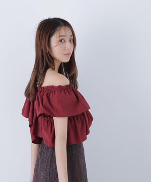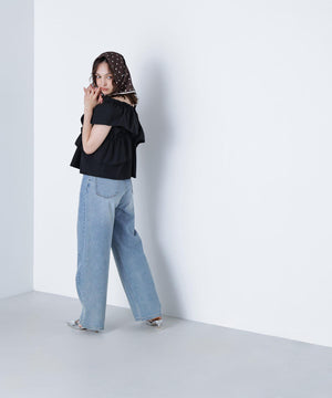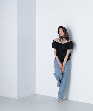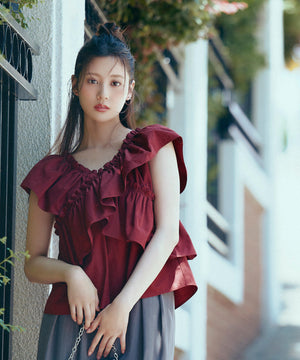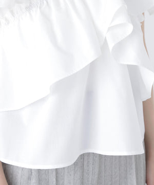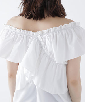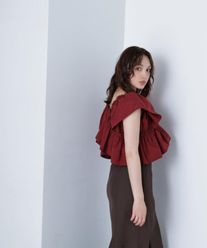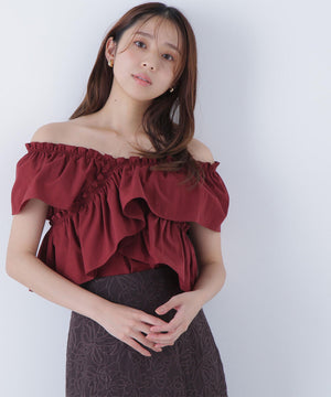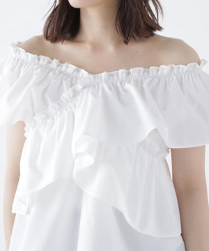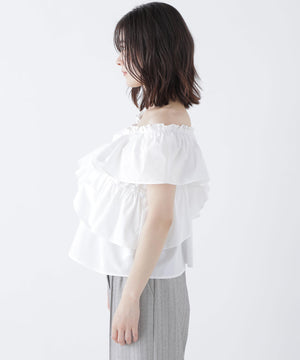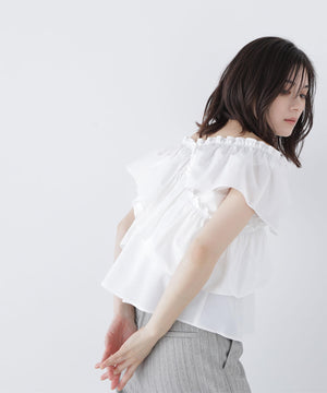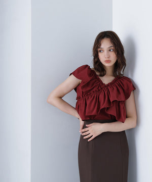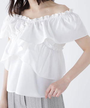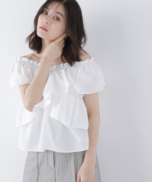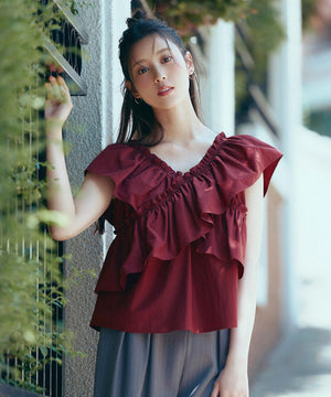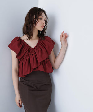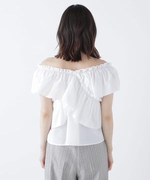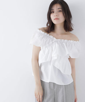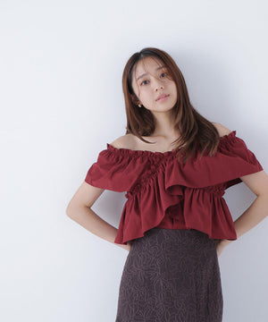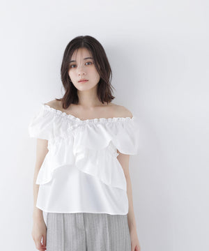 ギャザーを寄せたフリルを身頃でクロスした華やかなブラウス。内側のフリル端には細ゴムを通しているので、Vネックブラウスとしても、肩を下げてオフショルダーとしても着られる2wayデザイン。着丈は、INもOUTもしやすいショート丈です。デニムやパンツ合わせは、裾をOUTしてラフに着たり、ナロースカートを合わせてタックインすると、すっきりとした着こなしが叶います。