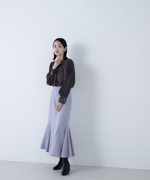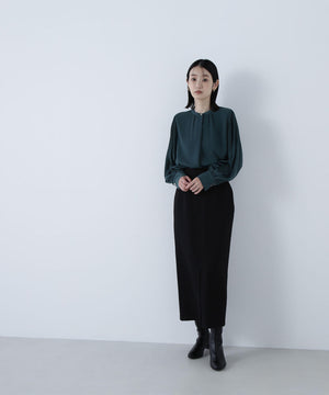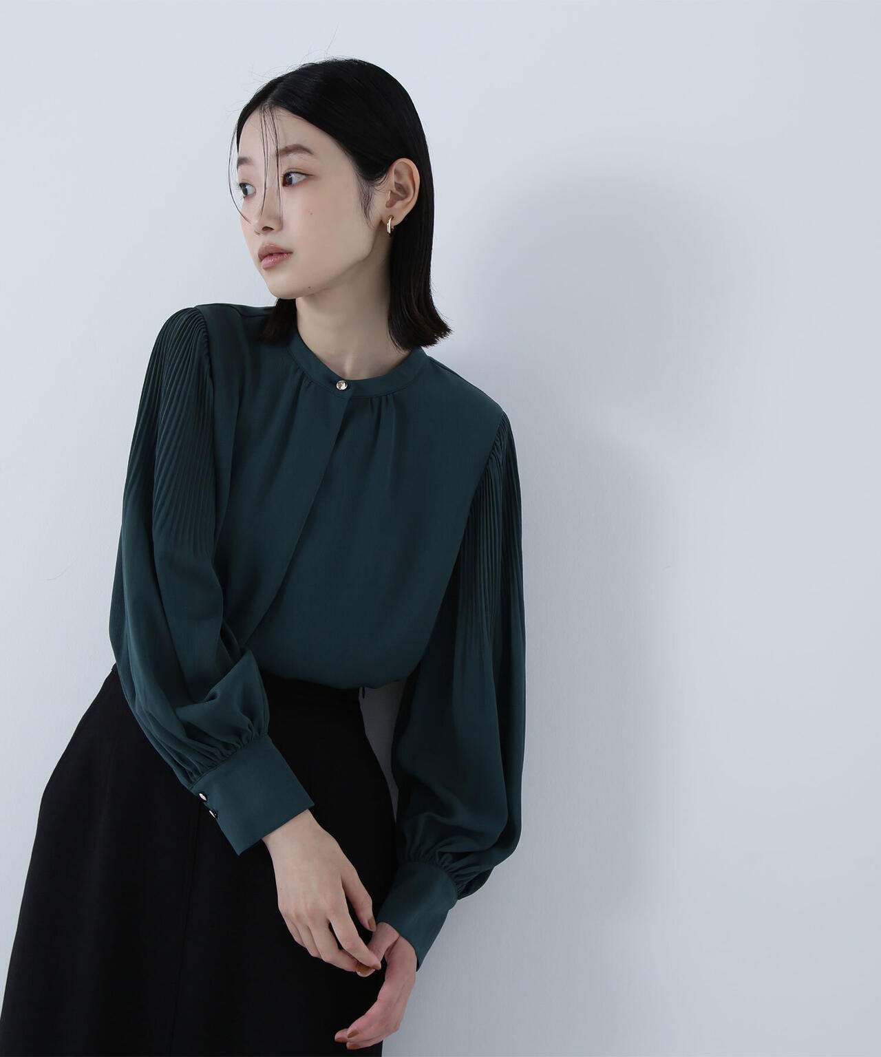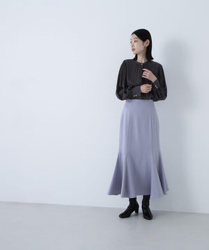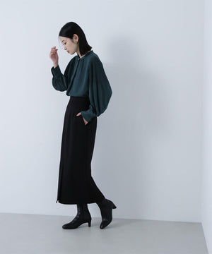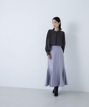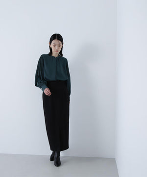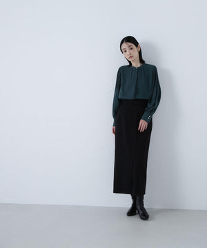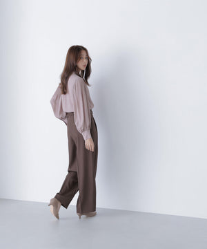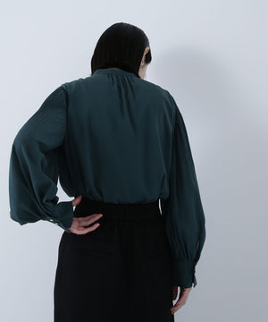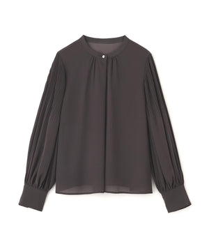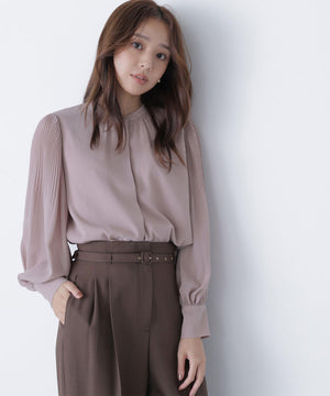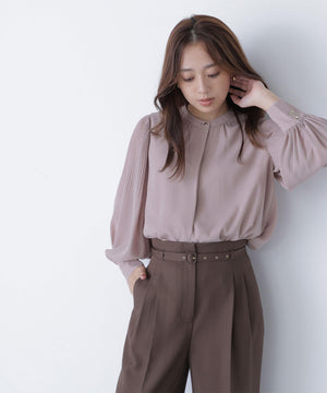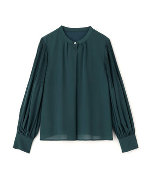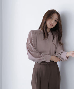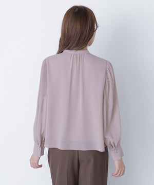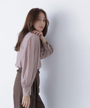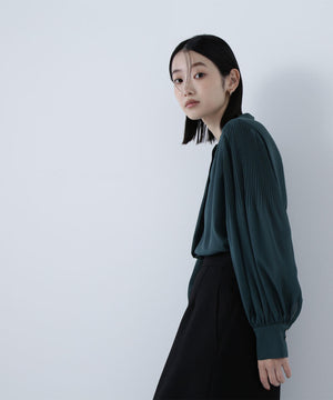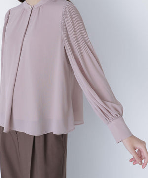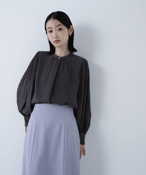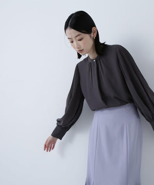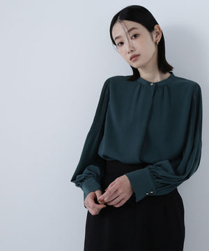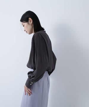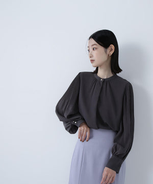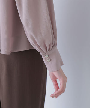 襟ぐりのメタルボタンをアクセントに効かせた楊柳ブラウス。袖に細かいクリスタルプリーツを入れる事で、ボリュームスリーブが引き立ち、女性らしい印象に見せてくれます。ジャケットインにも映える上品なネックデザインなので長く着ていただけます。