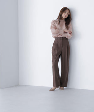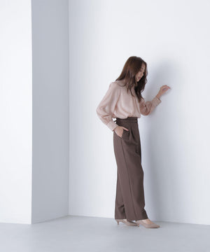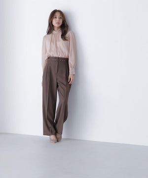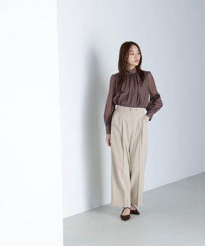 NBB人気のブラウスに秋カラーが登場!ハイネックデザインの後ろは、ゴールドカラーの釦を2つ並べて品のある雰囲気を演出。袖に裏地が付いていないので透け感を楽しめます。ウエストインすると、ボリュームのあるブラウジングのシルエットになります。