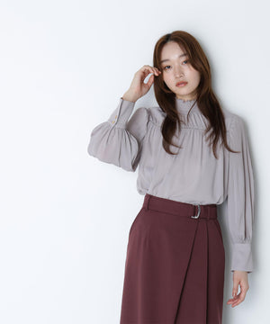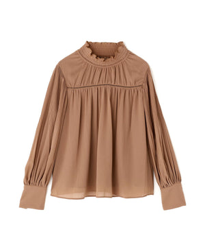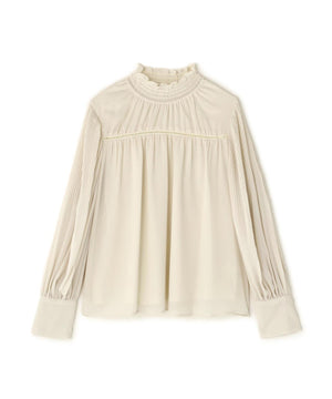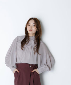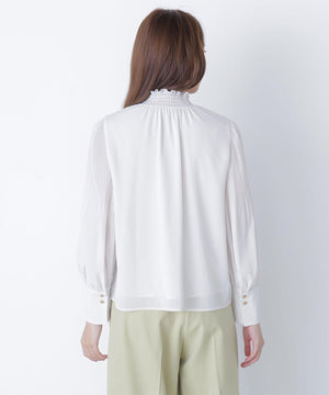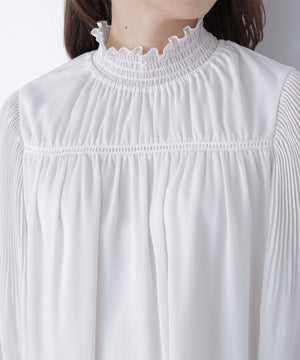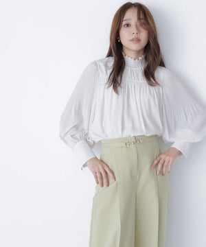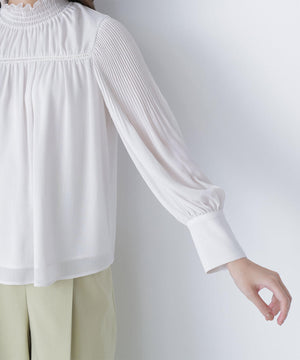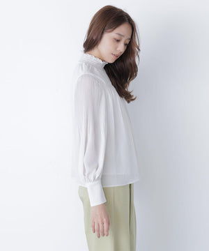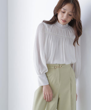 襟に入れたシャーリングデザインがポイントの楊柳ブラウス。袖には細かいクリスタルプリーツを入れる事で、ボリュームスリーブが引き立ち、女性らしい印象に見せてくれます。身頃はハシゴレースを効かせて、フェミニンで華やかな雰囲気をプラス。シャーリングネックが映えるきちんと感があるデザインは、オフィスシーンからデイリーまで着回せます。