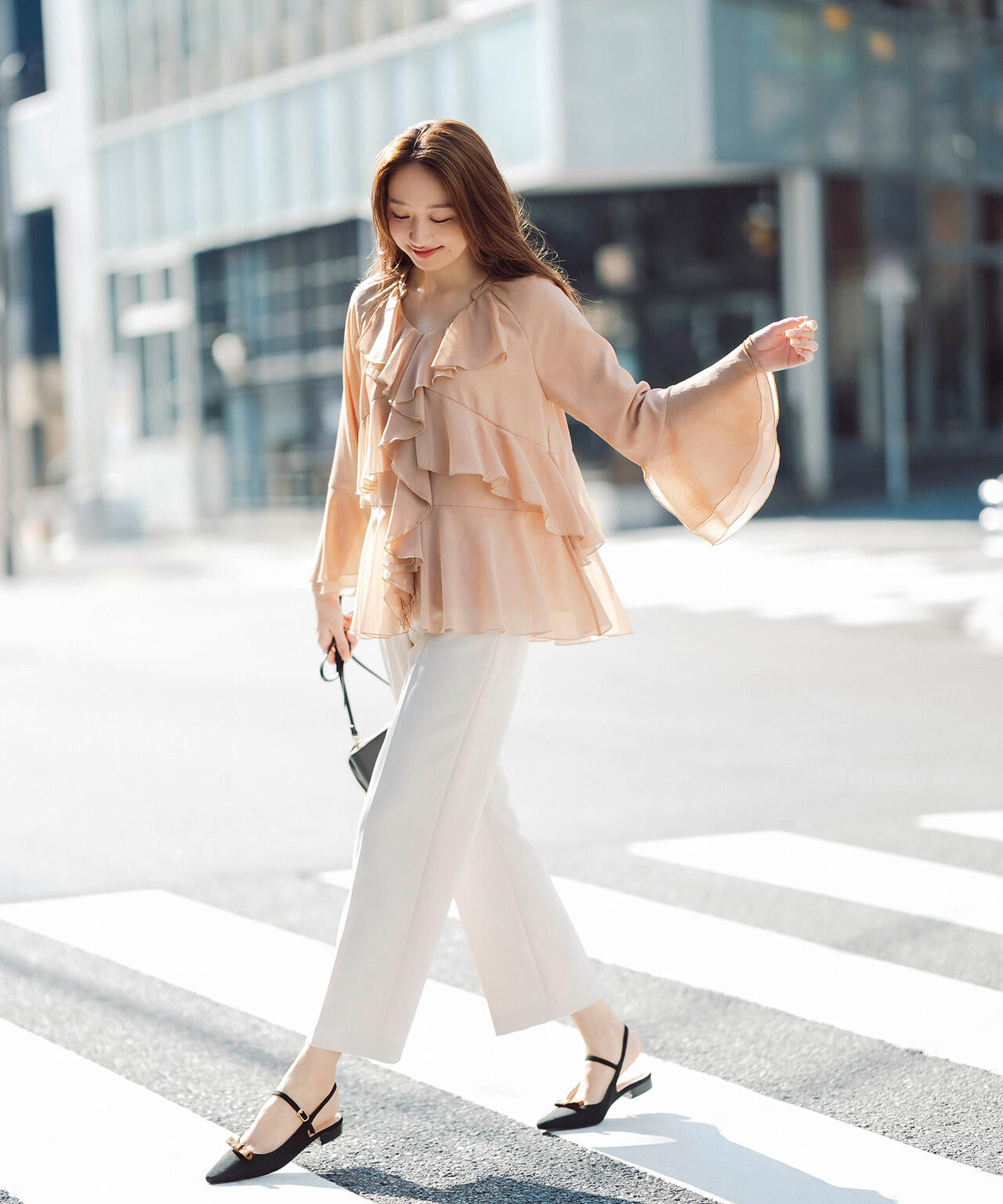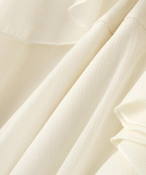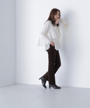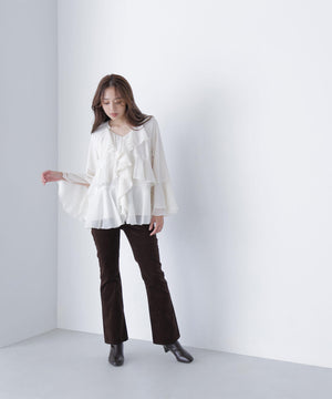 トレンドのボーホースタイルの雰囲気が今年らしいラッフルフリルのチュニックブラウス。身頃と袖口にラッフルフリルをあしらい、揺れ感とボリューム感に拘ったデザインです。袖下と前裾のフリルにはスリットが入り、動いた時の抜け感と軽やかさを演出。襟はVネックで抜け感をだし、着丈は腰まで隠れるチュニック丈です。細身シルエットのパンツやデニムを合わせ、トレンドカジュアルなスタイリングがおすすめです。