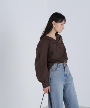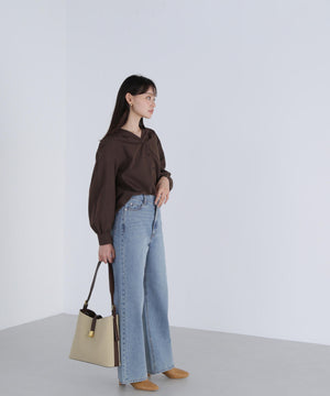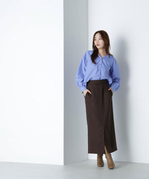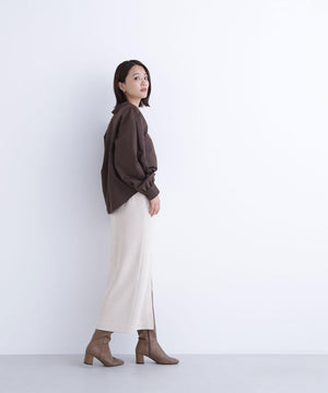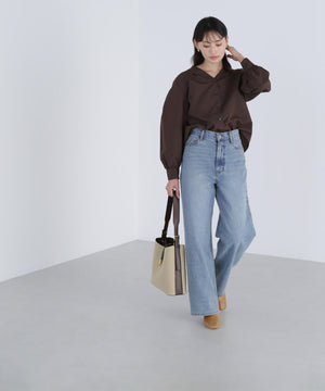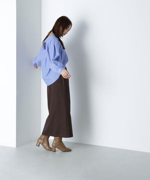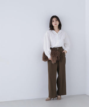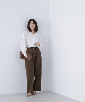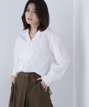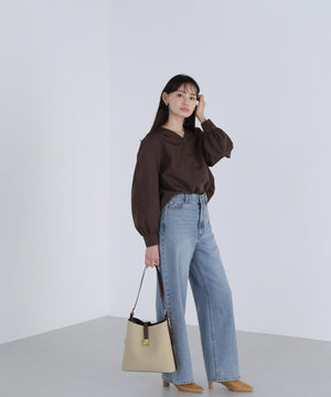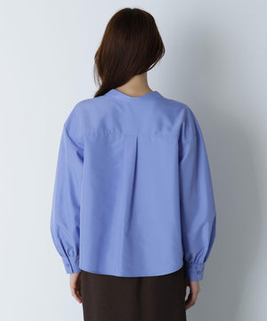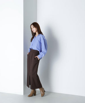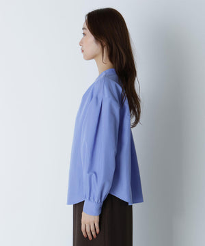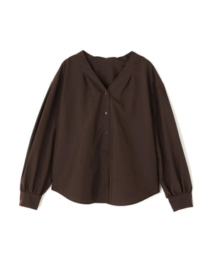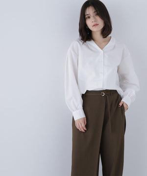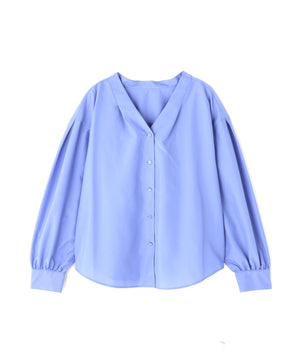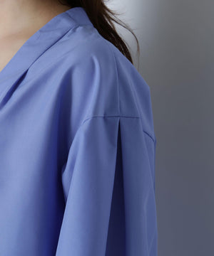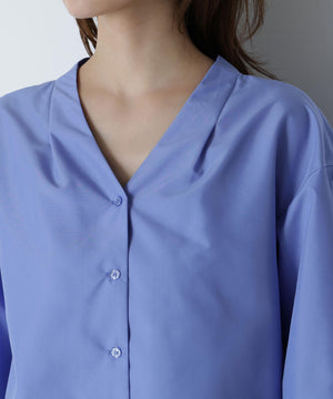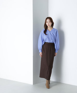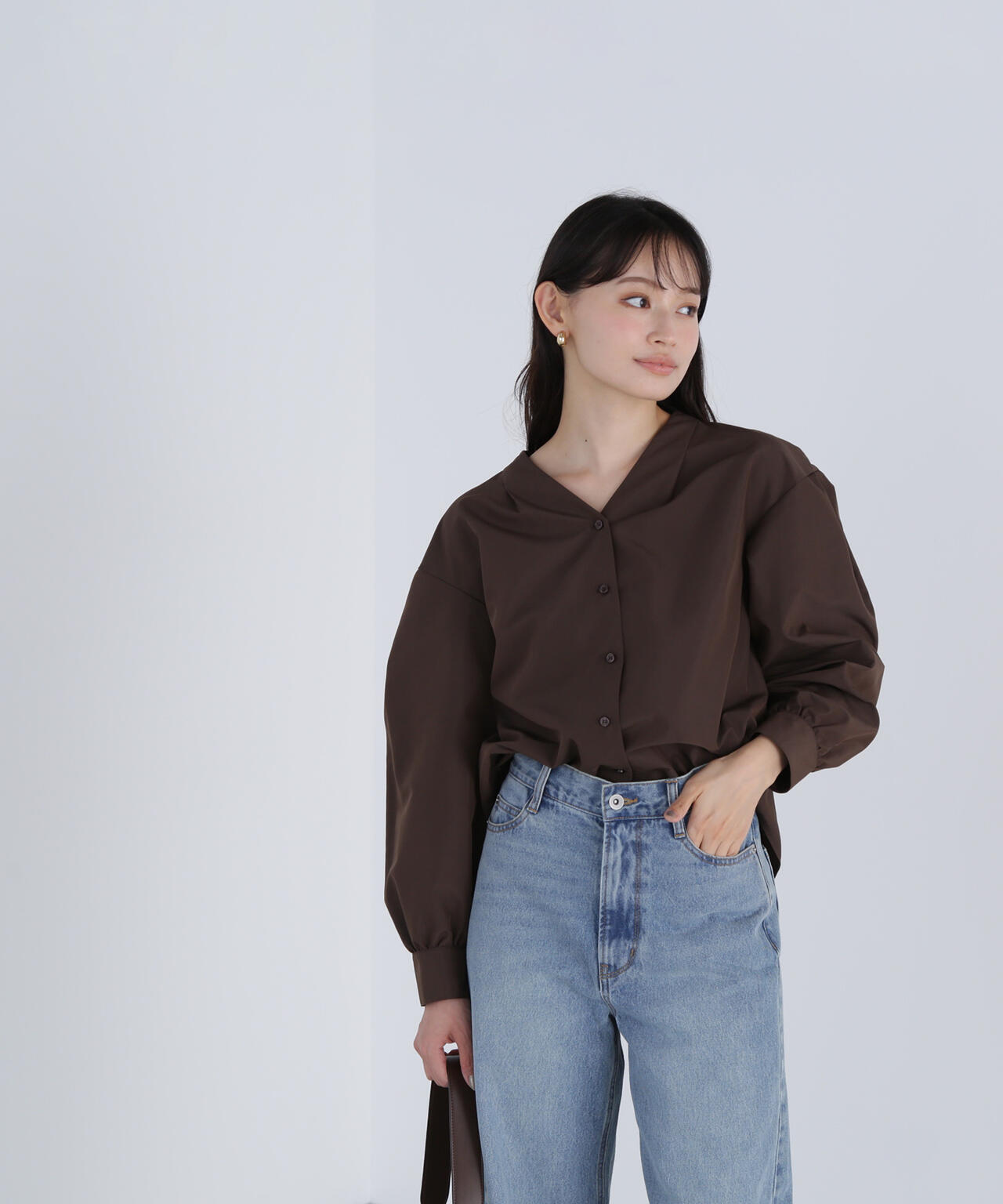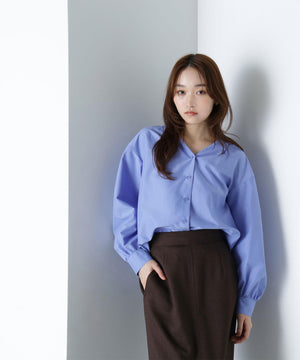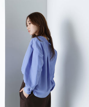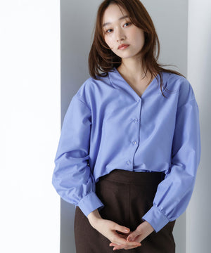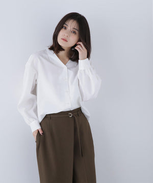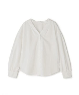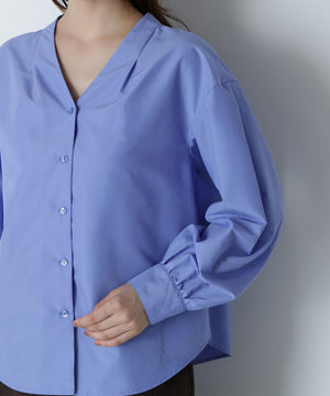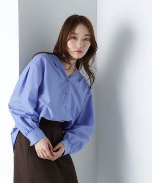 Vネックデザインが首元に抜け感を作りながら、暑い季節も涼しげに着られるブラウス。襟が少し後ろに抜けたようなネックラインで、女性らしい印象に見せてくれます。フォルム感のあるシルエットも着こなしのポイント。トップスインでもアウトでも決まる丈感です。合わせるボトムスによって、ONにもOFFスタイルにも着回せるデザインです。