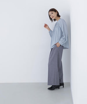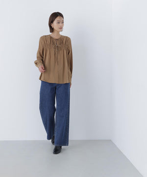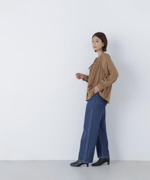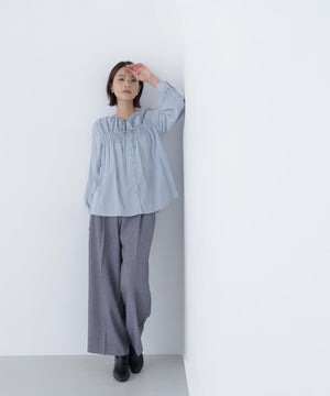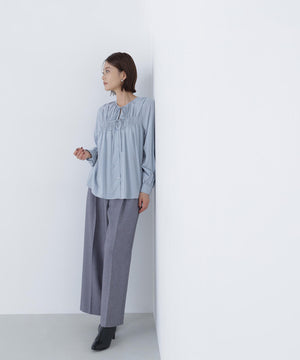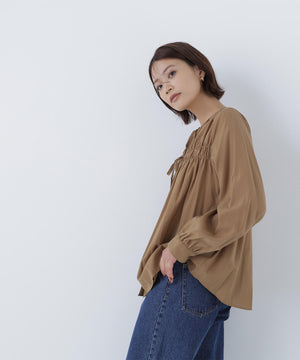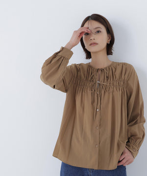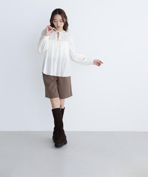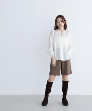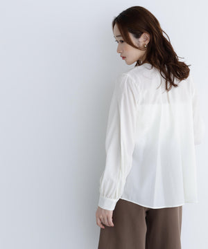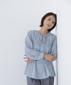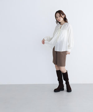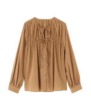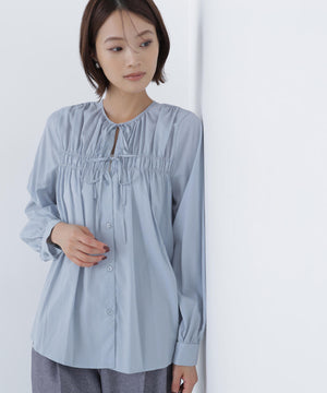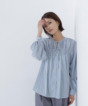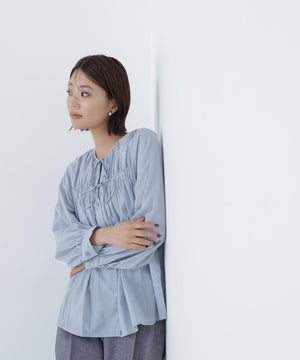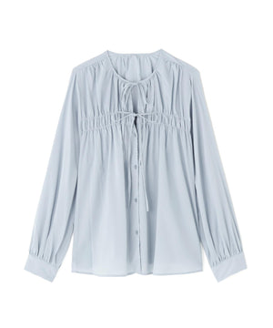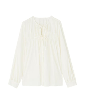 華奢なリボンがポイントのブラウス。セットインの肩幅がシルエットをすっきり見せてくれます。リボンをほどいて羽織りにも使えるデザインなので、季節の変わり目にあると便利なアイテムです。