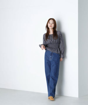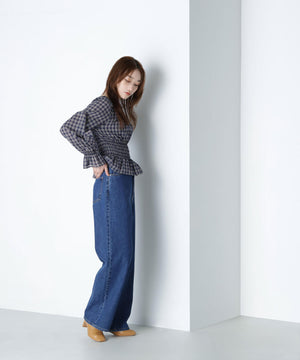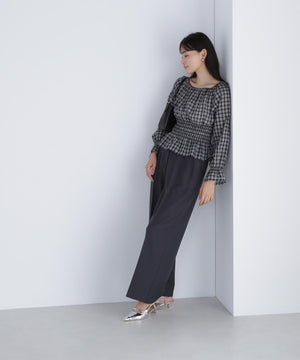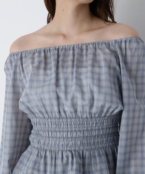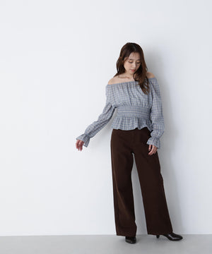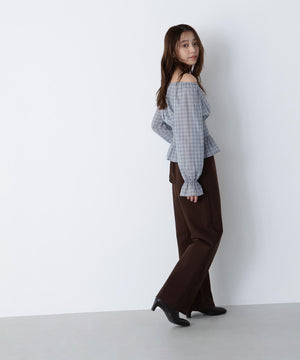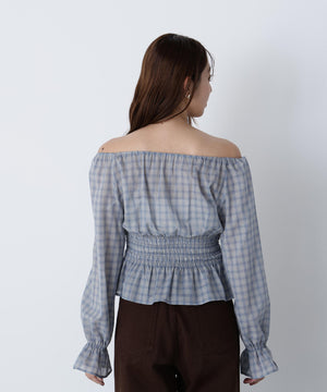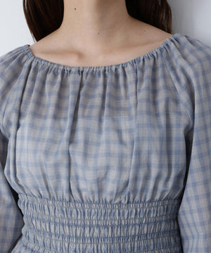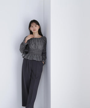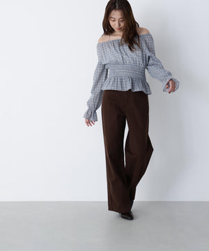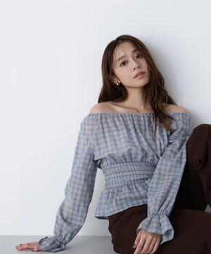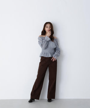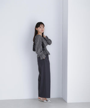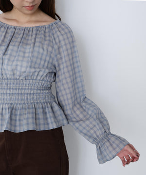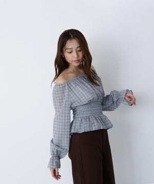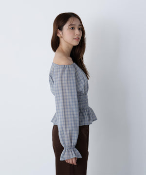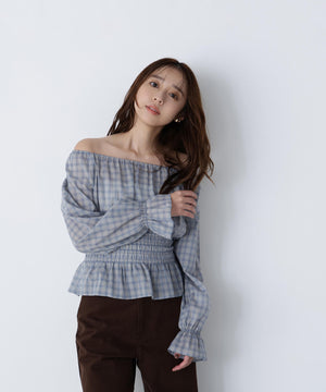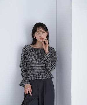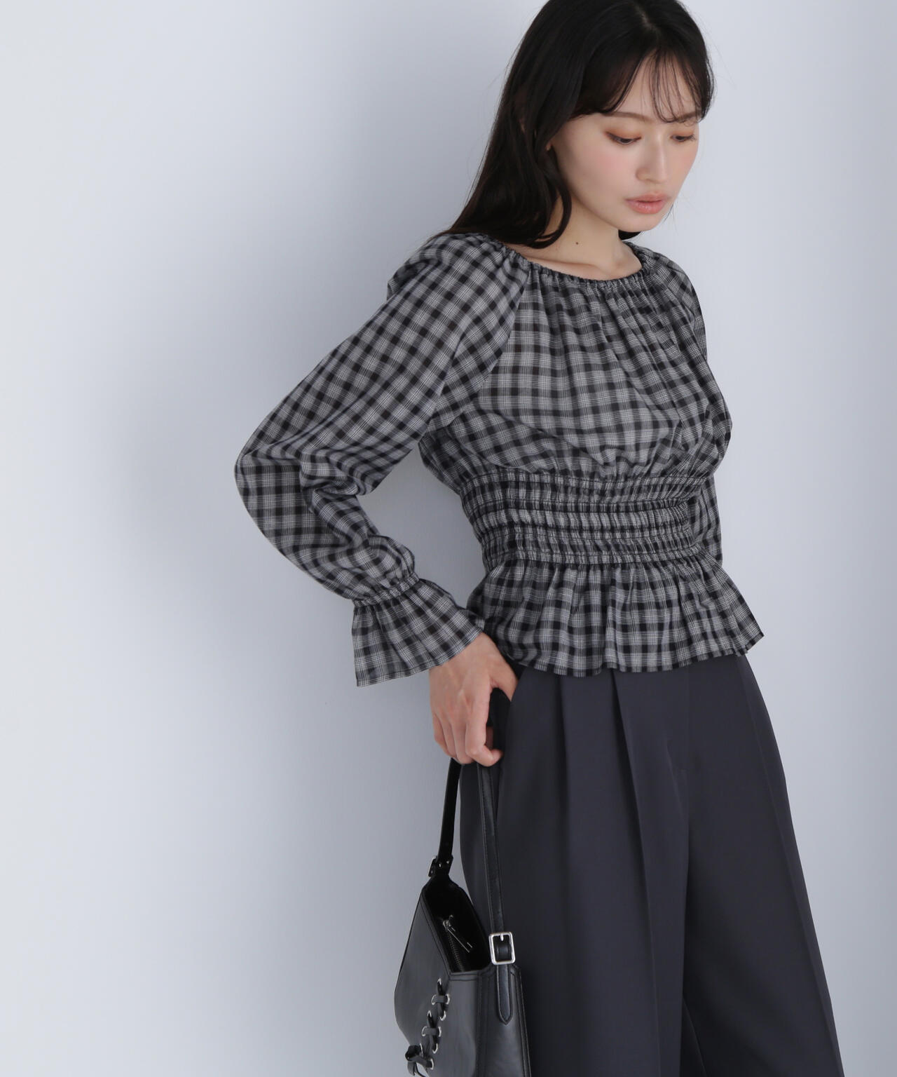 秋らしいチェック柄が目を引くペプラムブラウス。暑さが残る時期から着られる、程よい薄手のコットン素材を使用しています。肩を落とすとオフショルダーとしても着こなせるデザイン。シャーリングでウエストマークしているので脚長効果を期待できます。
