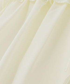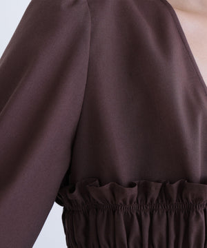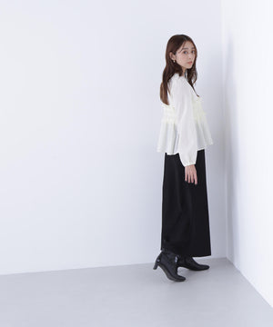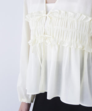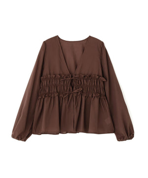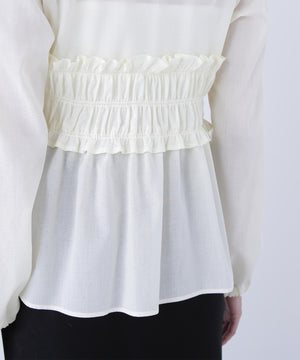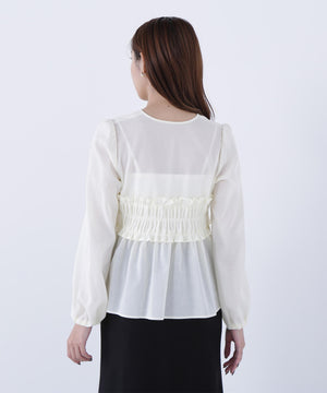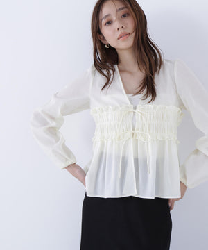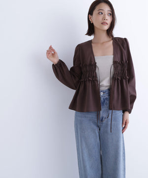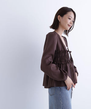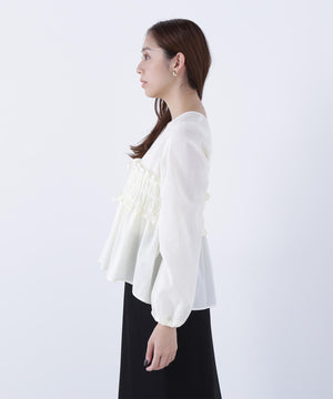 季節の変わり目にあると便利なペプラムブラウス。どこから見てもシャーリングディテールが映えるデザインです。バルーンスリーブの袖口はゴム仕様、袖口をたくし上げると袖丈の調節が可能。フロントリボンをほどくと羽織りとしても着ていただけます。