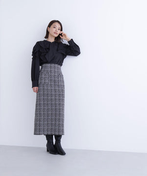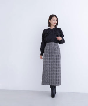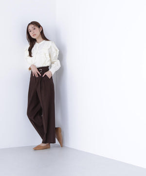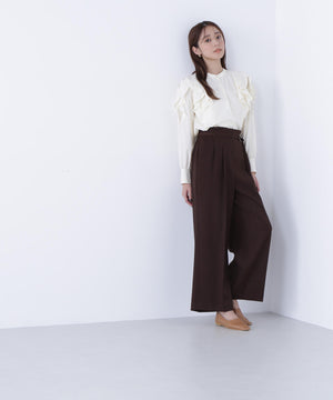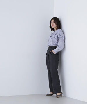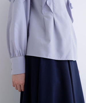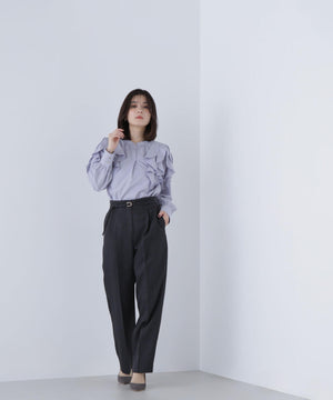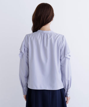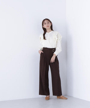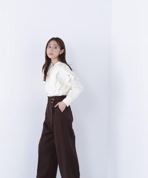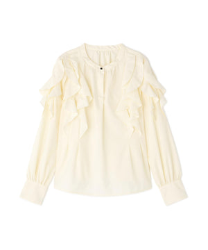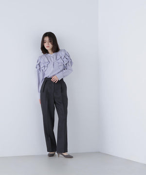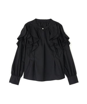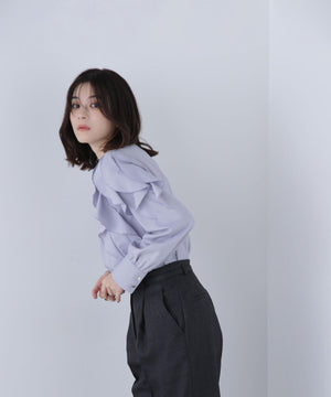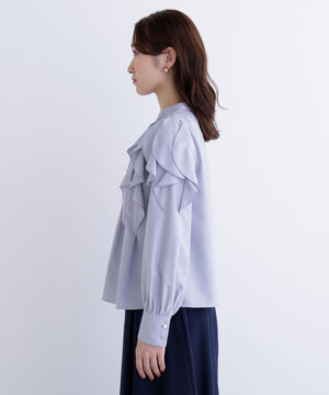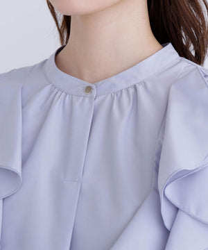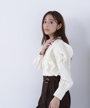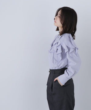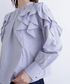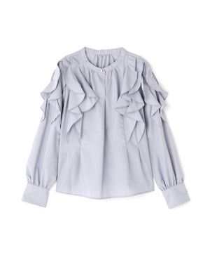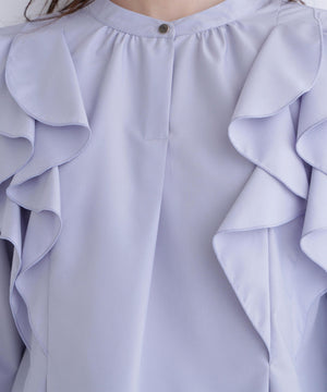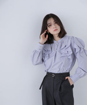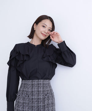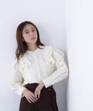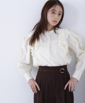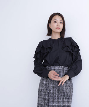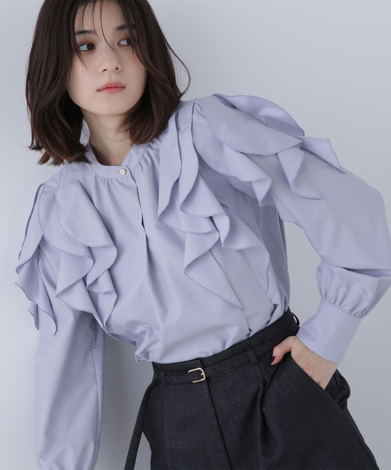 袖と身頃にふんだんにあしらったラッフルフリルがポイントのブラウス。落ち感のあるラッフルフリルなので、上品で華やかな雰囲気を演出します。フロントはメタル釦を効かせてきらっとポイントをプラス。ナロースカートやストレートパンツなどを合わせた、キレイめなスタイリングがおすすめです。