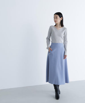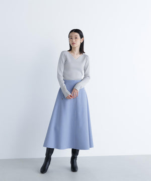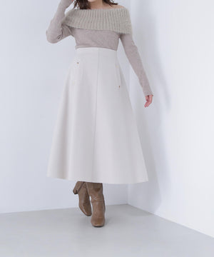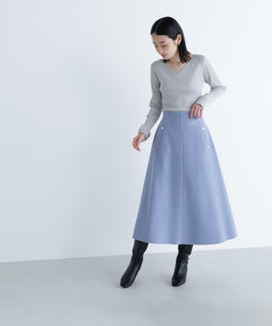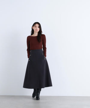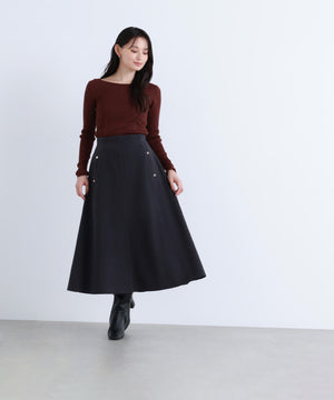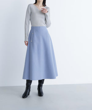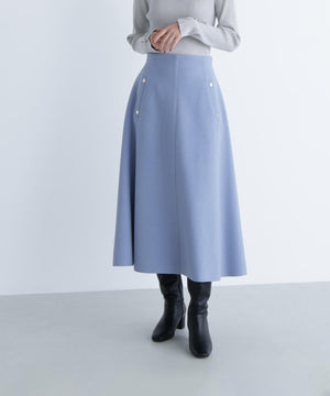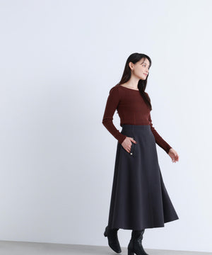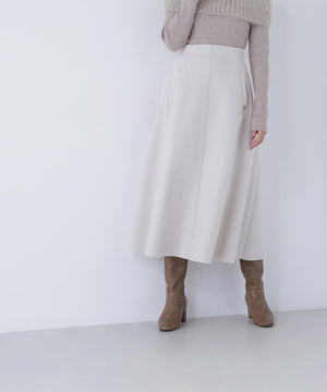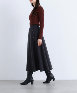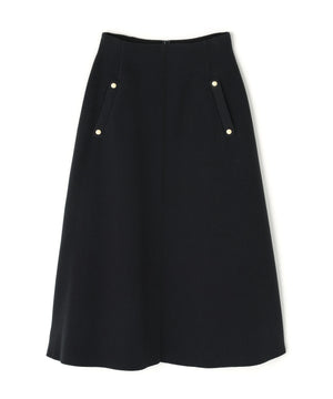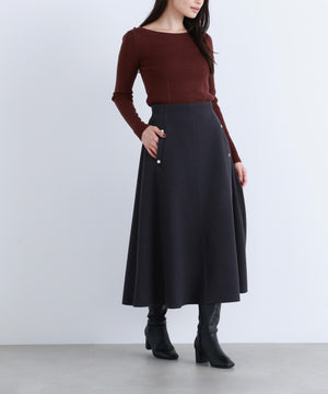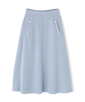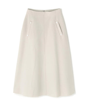 しなやかな圧縮ジャージー素材を使用したフレアスカート。ポケットに付けたライトゴールドカラーのドット釦が、上品なアクセントになっています。フロントハギのデザインによって、縦ラインを強調された1枚。続きのウエストシルエットなので、トップスはインでもアウトでもすっきりと決まります。