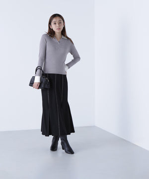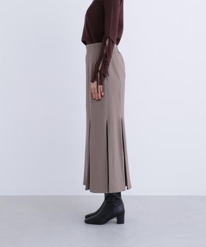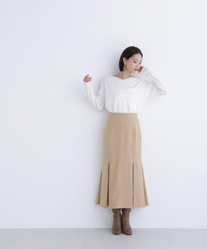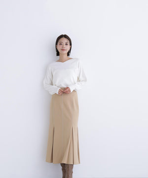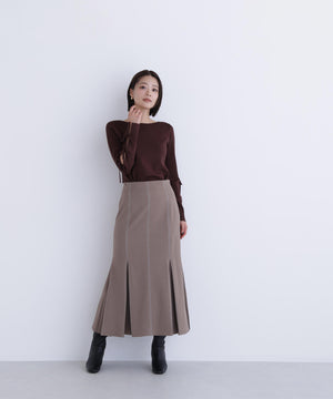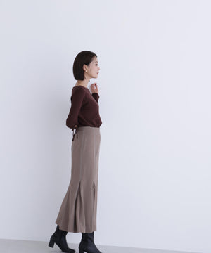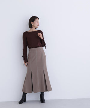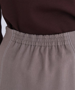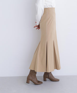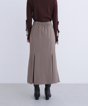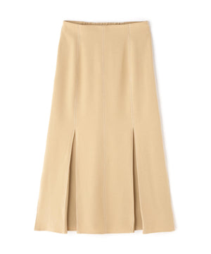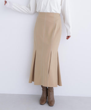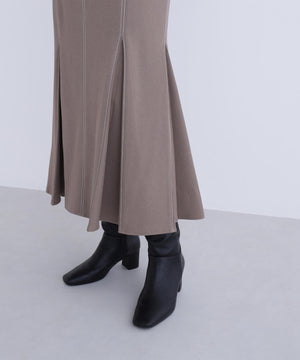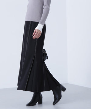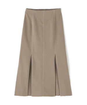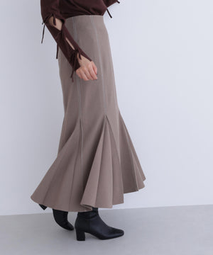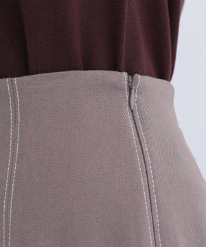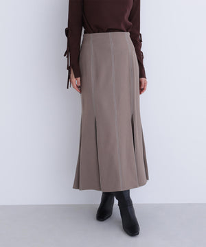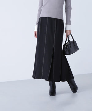 ステッチを効かせたマーメイドシルエットのスカート。配色ステッチを入れたデザインで、より縦ラインを印象的に見せながら、スタイルアップ効果も期待できます。タック奥にはマチを入れてすっきりと、動くたびに揺れ感のあるシルエットを演出します。後ろウエストはゴム仕様でストレスフリーなはき心地。オフィスから普段着まで幅広いシーンに着回せます。