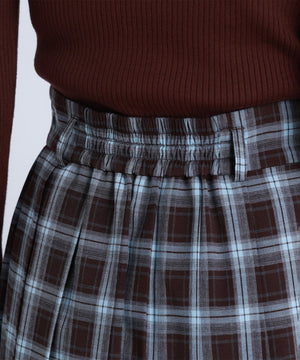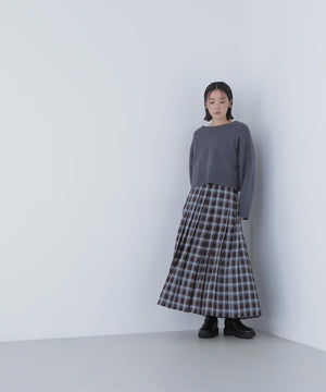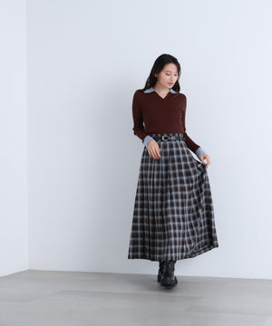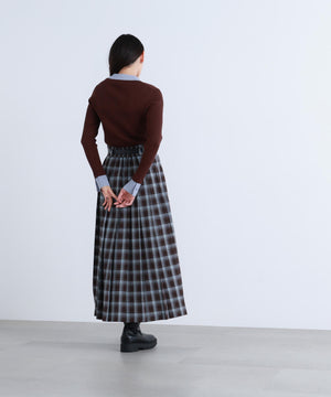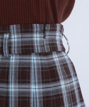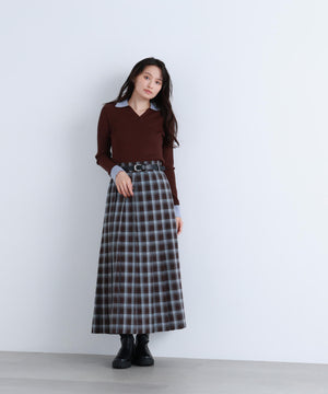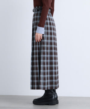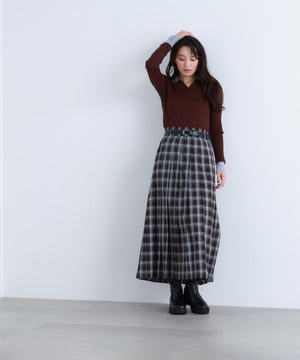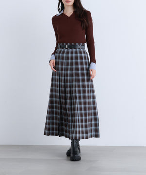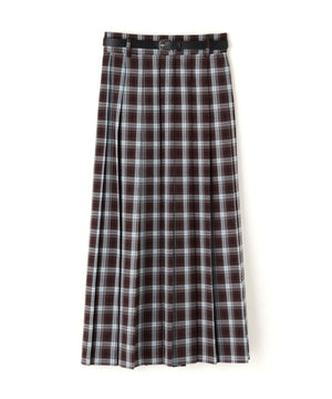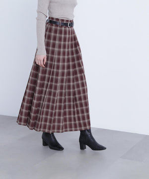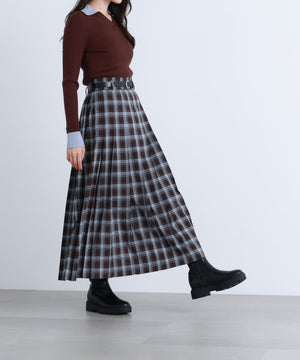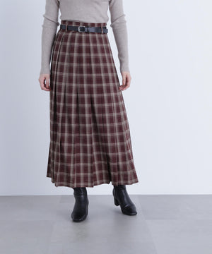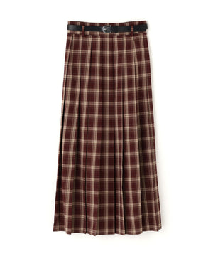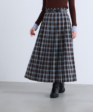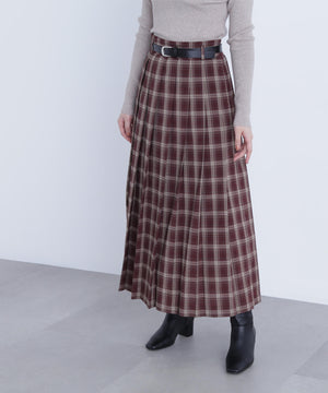 クラシカルなチェック柄が映えるプリーツロングスカート。太めのプリーツ幅とロング丈の組み合わせで、カジュアル感が増すデザインです。ハイウエストデザインに黒の合皮ベルトを合わせており、スタイルアップ効果を期待。後ろウエストはゴムシャーリング仕様でフィットします。トップスをインするだけでコーディネートが決まります。
