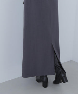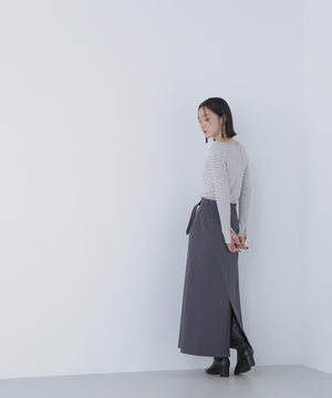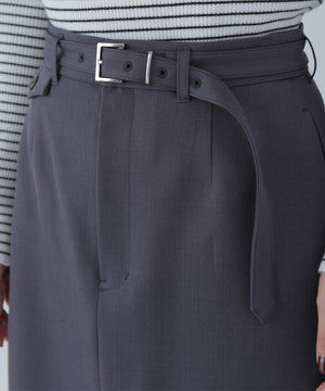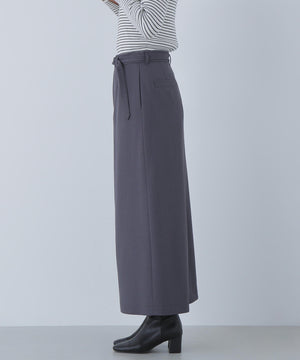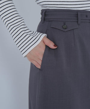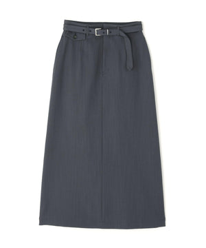 通勤から休日スタイルまで活躍できるマニッシュな雰囲気のセミフレアロングスカート。シルバーカラーのバックルを付けたベルトが、スタイルを引き締めるアクセントになっています。ベルトを取り外すとシンプルな着こなしにもアレンジ可能。右前の配色釦を付けたフラップデザインがさりげないポイント。後ろはセンタースリット入りで足さばきが良く、ロング丈でも動きやすいデザインです。