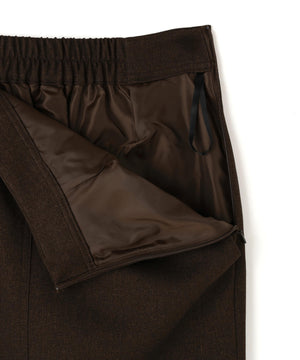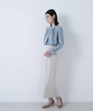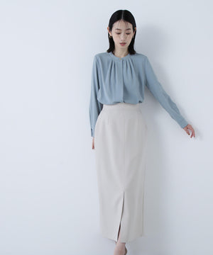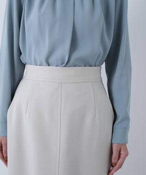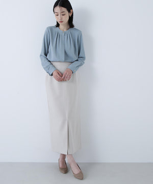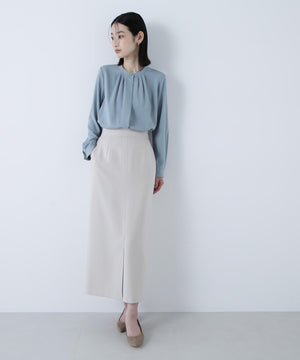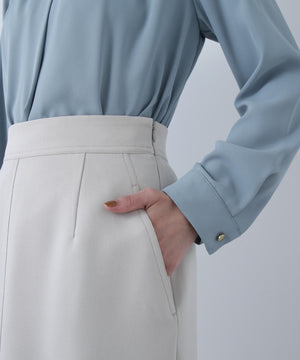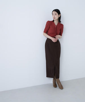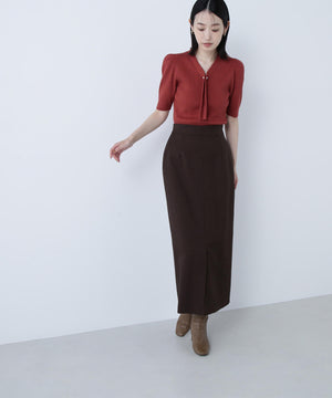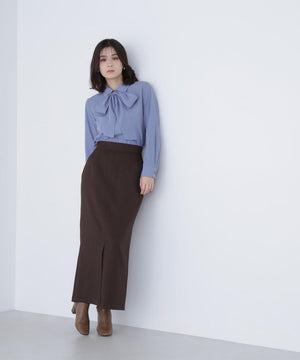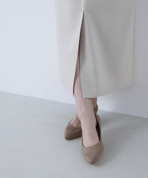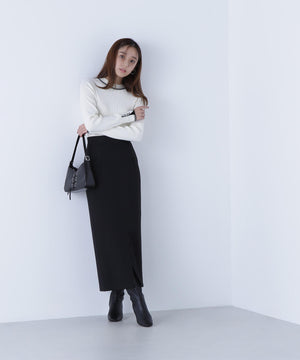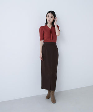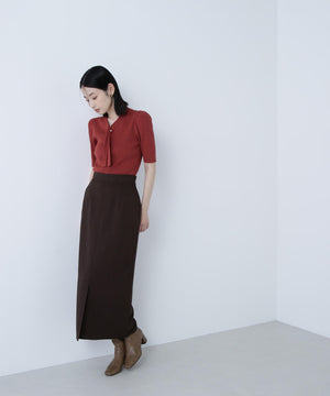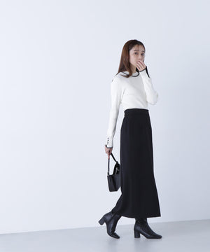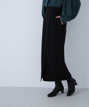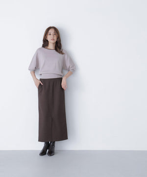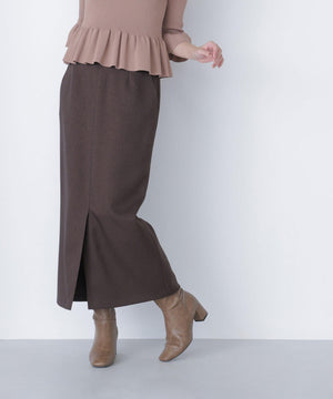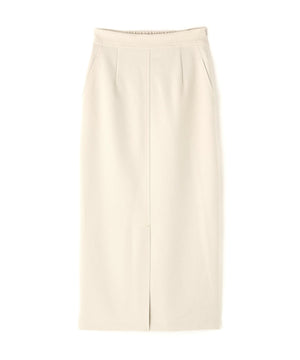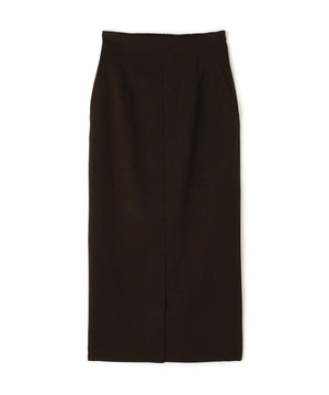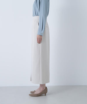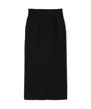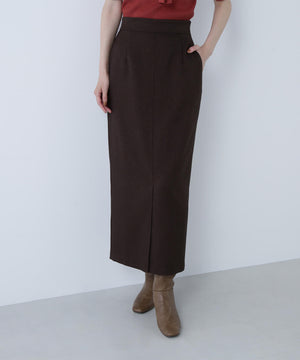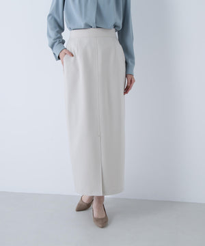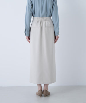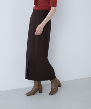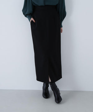 どんなトップスとも合わせやすいミニマルなデザインで、着回し力バツグンのナロースカート。フロントはベンツ開きにして足元に抜け感を出したデザインです。程よい厚みのある生地なのでロングシーズン着ていただけます。後ろウエストはゴム仕様。合わせるトップスや小物により、キレイめオフィスコーデからカジュアルスタイルまでデイリーに活躍します。両脇ポケット付き。