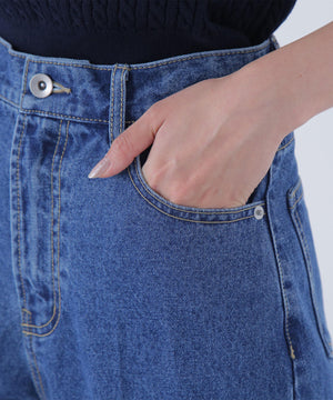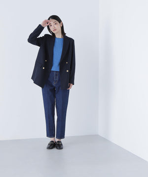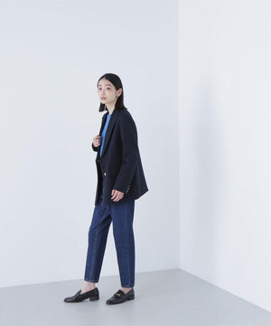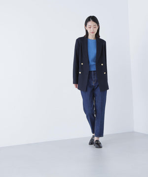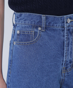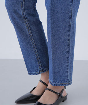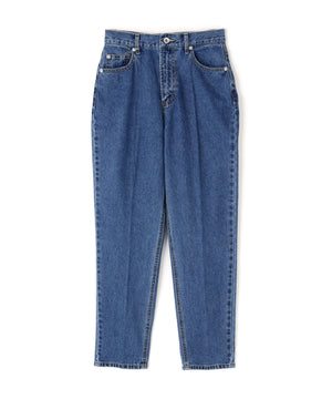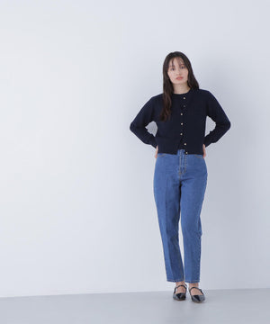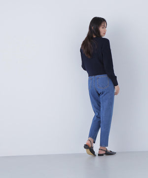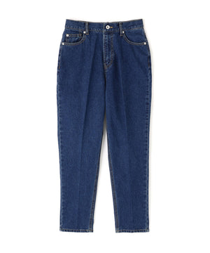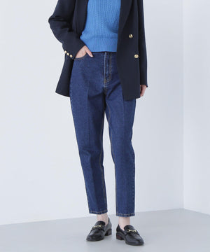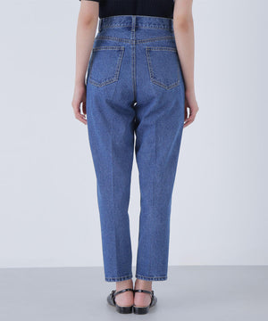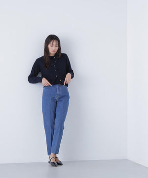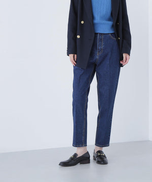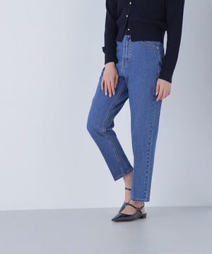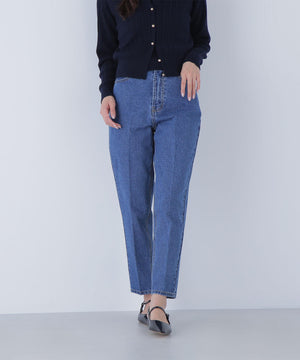 スタイルアップ見えするセミテーパードラインのデニムパンツ。高すぎないウエストで、腰まわりがすっきり着られるサイズ感です。裾でたるみの出ない丈と裾幅に拘り、シャープなIラインシルエットを叶えます。センタープレスが脚のラインをキレイに見せてくれます。