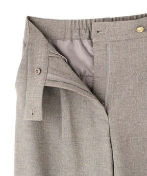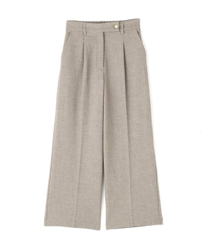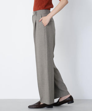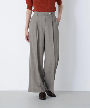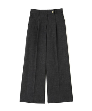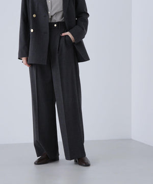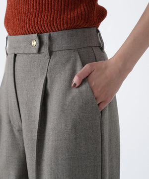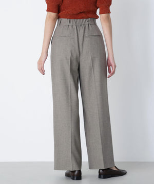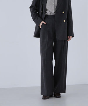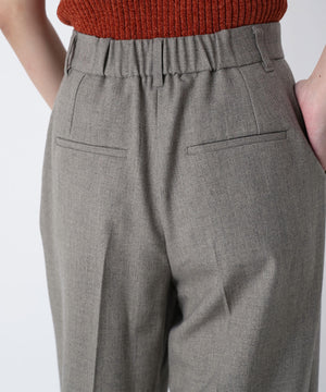 センタープレスが縦ラインを強調して脚をキレイに見せてくれる1本。ウエストタックを少し中縫いすることで、お腹まわりをすっきり見せてくれるデザインです。ウエストに付けたゴールドカラーの釦がきらっとポイント。後ろウエストはゴム仕様でラクなはき心地です。同素材のジャケットとのスーツスタイルもおすすめです。