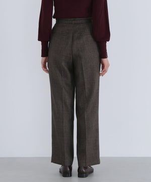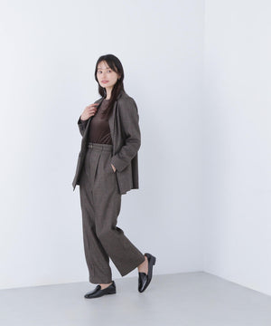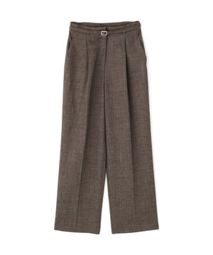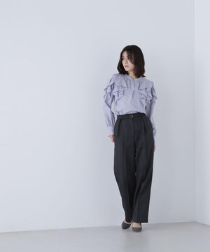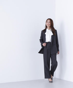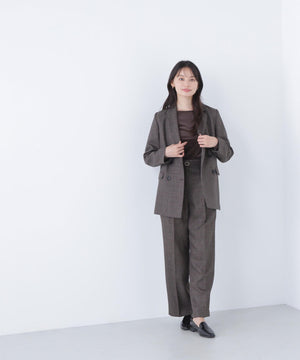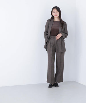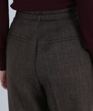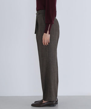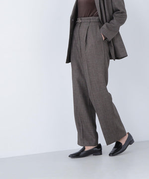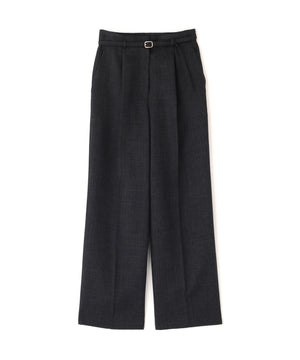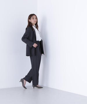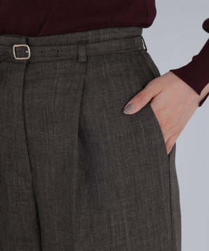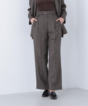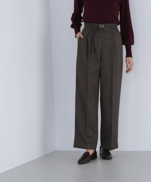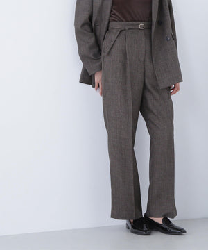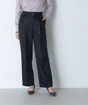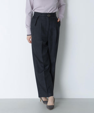 脚の肉感を拾いすぎず、レッグラインをキレイに見せてくれるストレートテーパードシルエットです。センタープレスが縦ラインを強調してよりスタイルアップを狙える1本。共地の細ベルトでウエストマークができ、華奢なゴールドカラーのバックルがポイントになります。同素材のジャケットとのセットアップがおすすめです。