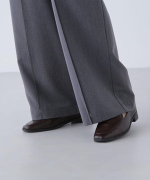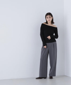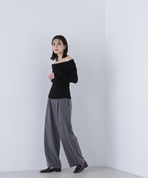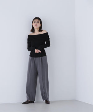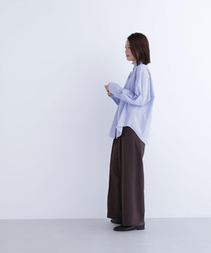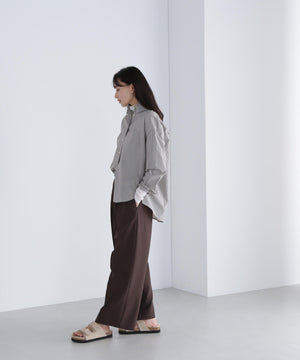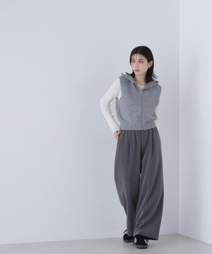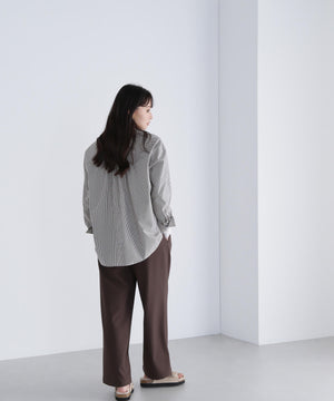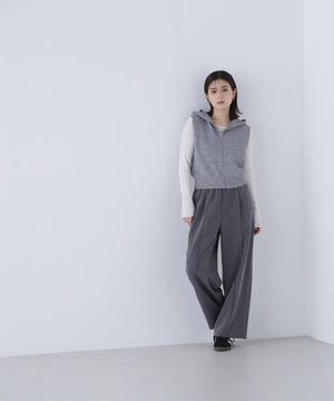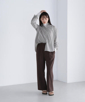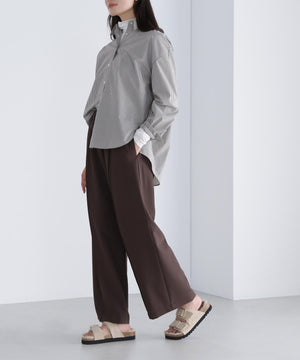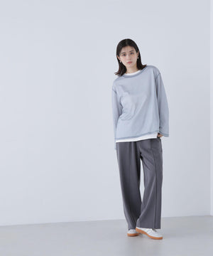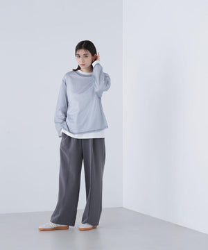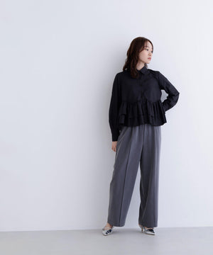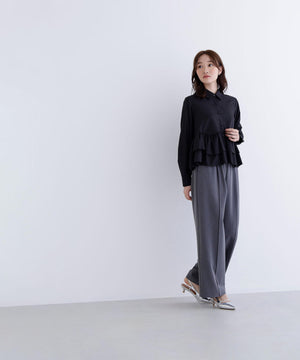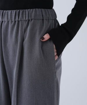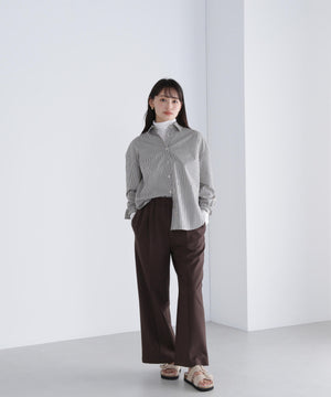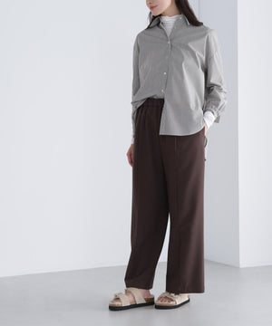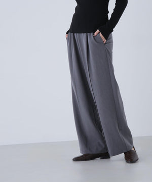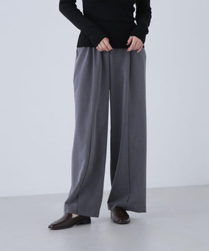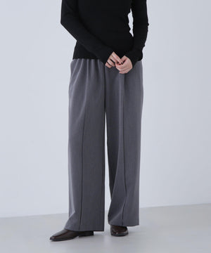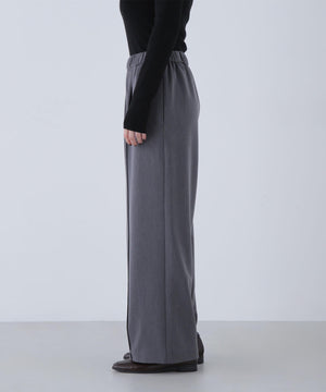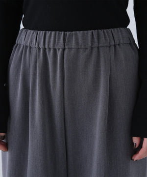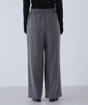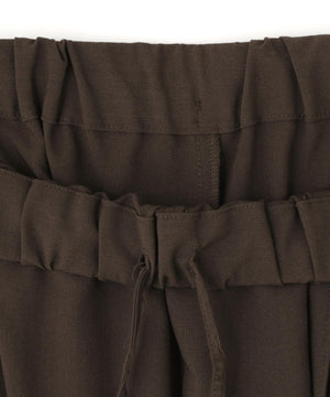 さらりとしたタッチの合繊素材を使用したイージーワイドパンツ。ウエストはお腹を締め付けないゴム仕様で、リラクシーなはき心地です。フロントのセンターラインはピンタックを効かせて、体のラインをすっきりと見せながら脚長効果も期待。ウエストの裏側は共紐でサイズ調整できます。