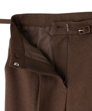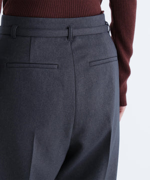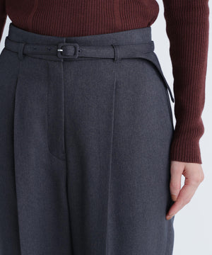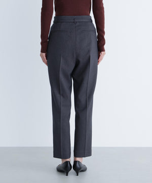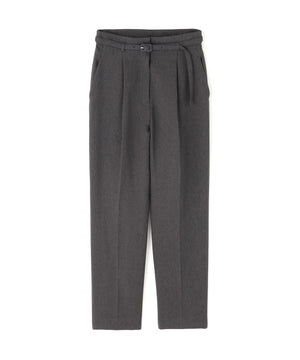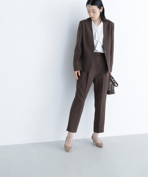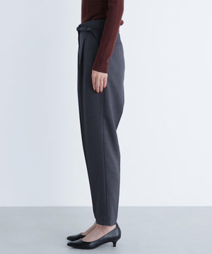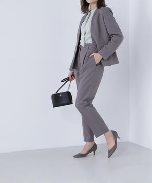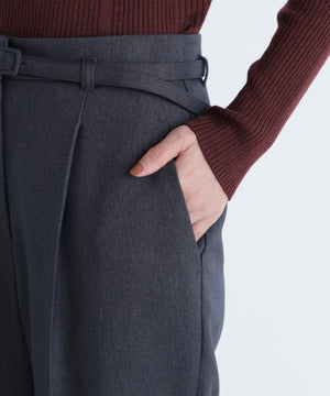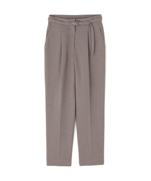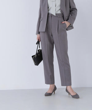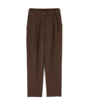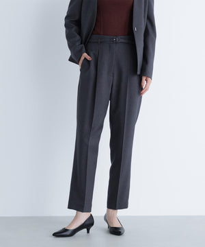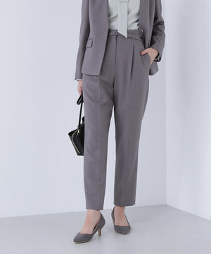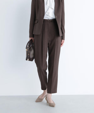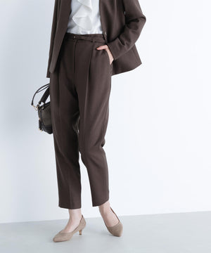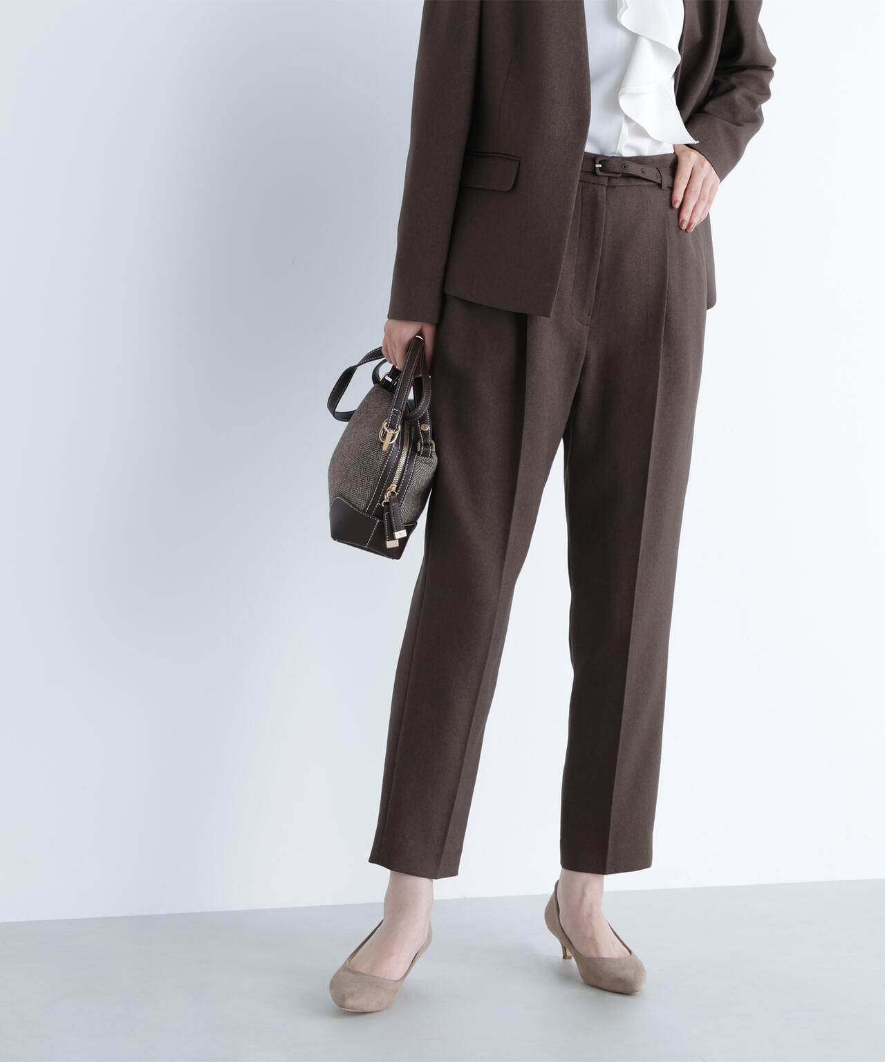 ハイウエストデザインとキレイなテーパードラインで、脚をすっきり見せてくれるテーパードパンツ。共地で包んだバックルが上品なベルト付きです。バックルのピン部分の金属がさりげなく光ってアクセントをプラス。同素材のジャケットを合わせると、洗練されたスーツスタイルが完成します。
