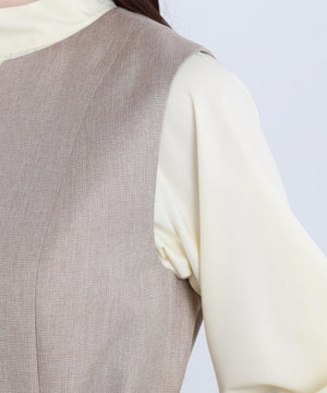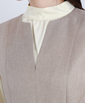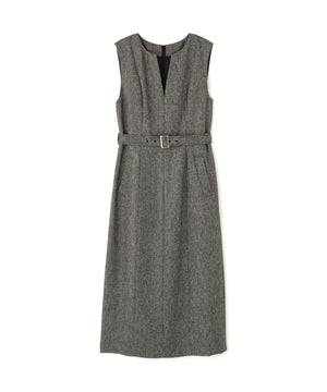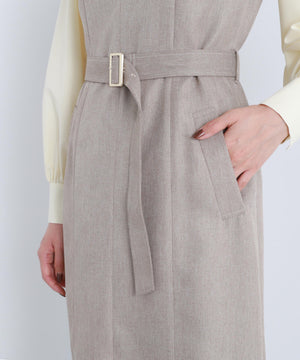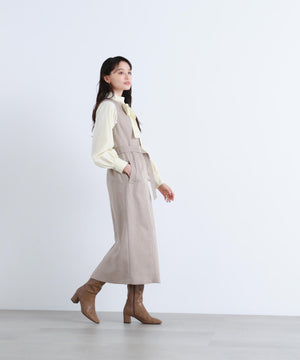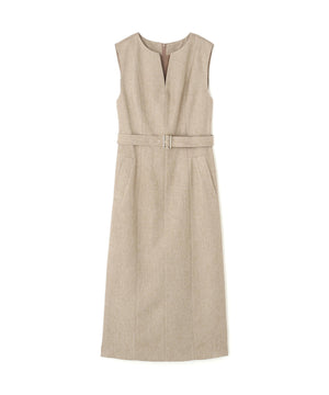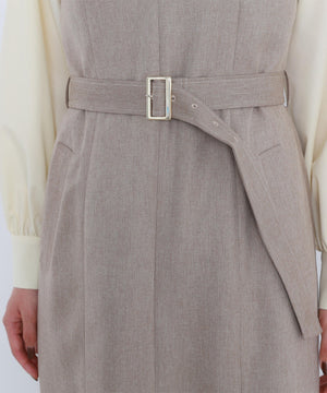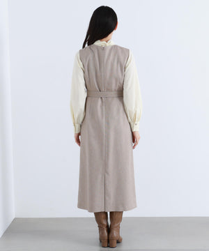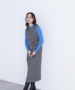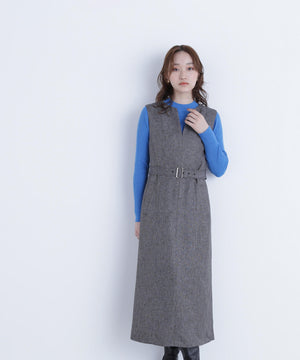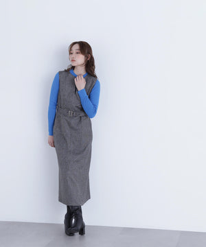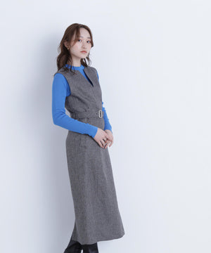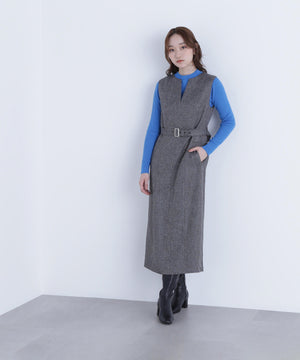 キーネックデザインでスッキリ大人っぽく着られるジャンパースカート。アームホールはゆとりがあるため、中にコンパクトなトップスはもちろん、ニットとも合わせやすくなっています。インナー次第でロングシーズン活躍できるデザインです。共地ベルト付き、後ろはセンターベンツ入りです。