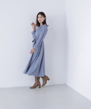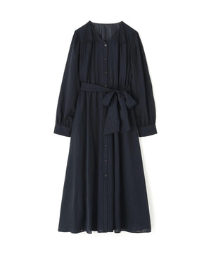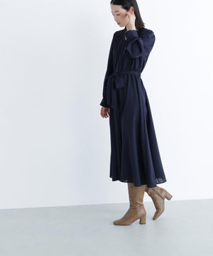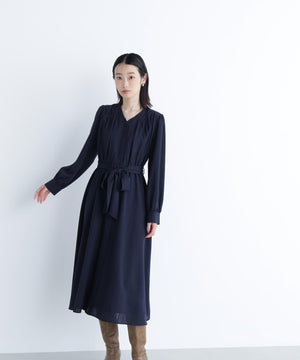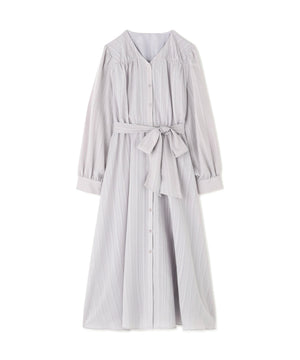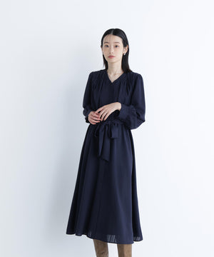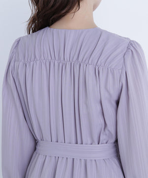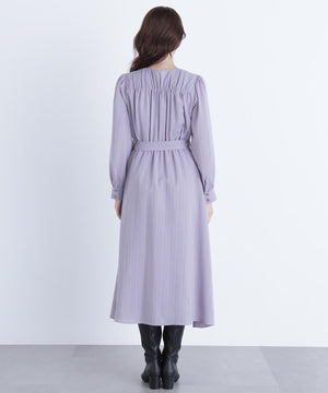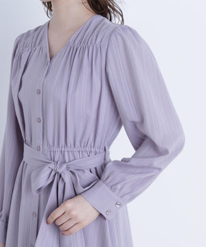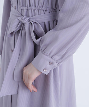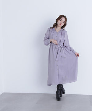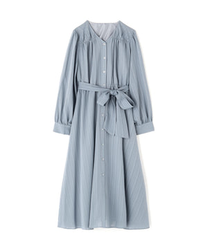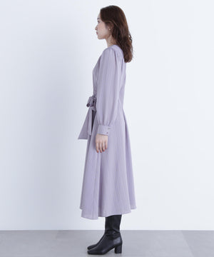 生地の織りでランダムストライプを表現した上品なワンピース。抜け感のあるVネックラインなので、ネックレス合わせもおすすめです。ウエストはゴム仕様でゆったりとした着心地。ウエストのリボンベルトは、片結びやリボン結びにするなど、巻き方によって雰囲気を変えて着こなせます。