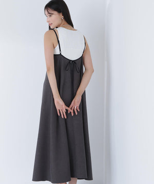 バイカラーのテープ使いをポイントにしたキャミワンピース。しっかりとした素材を使用しているため、1枚でも透け感を気にしないで着ていただけます。インナーに合わせて肩紐は長さ調節可能、サイドはポケット付きです。